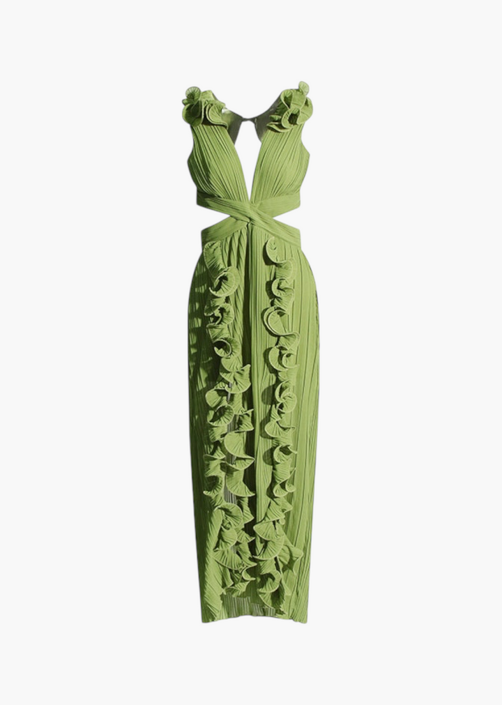 This stunning maxi dress is a showstopper with its unique combination of textures and details. The dress is made from a plisse fabric, which provides a beautiful, all-over pleated texture. The top features a plunging neckline with ruffled trim that continues down the front of the skirt. A unique detail of the dress is the side cutouts at the waistline that reveal a flash of skin. This dress is a perfect choice for a special occasion where you want to make a memorable entrance.