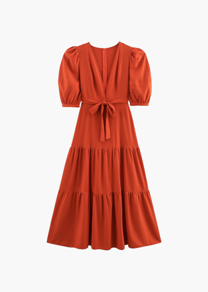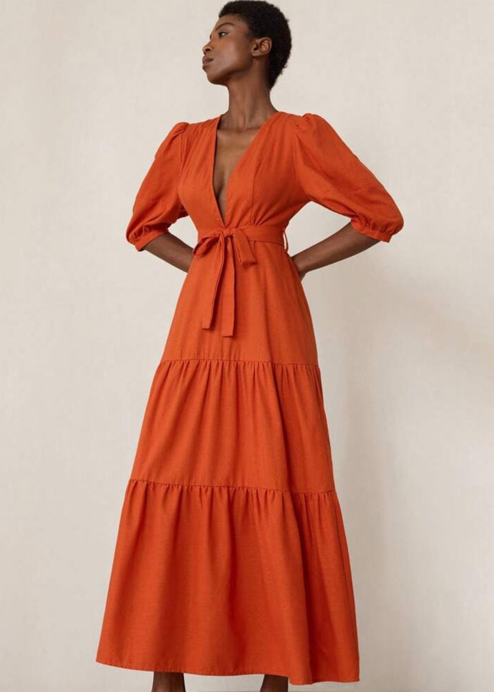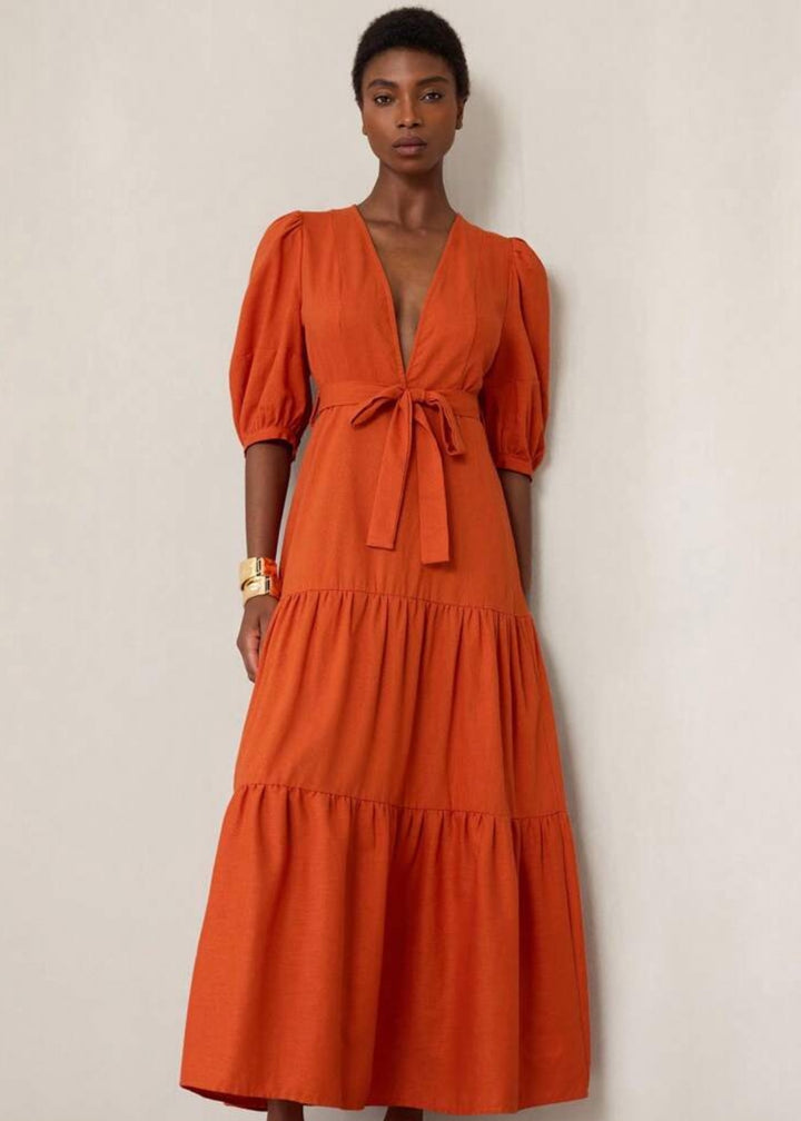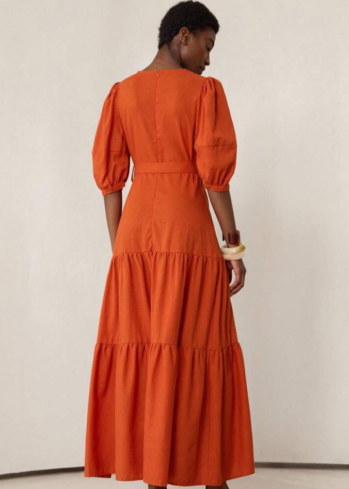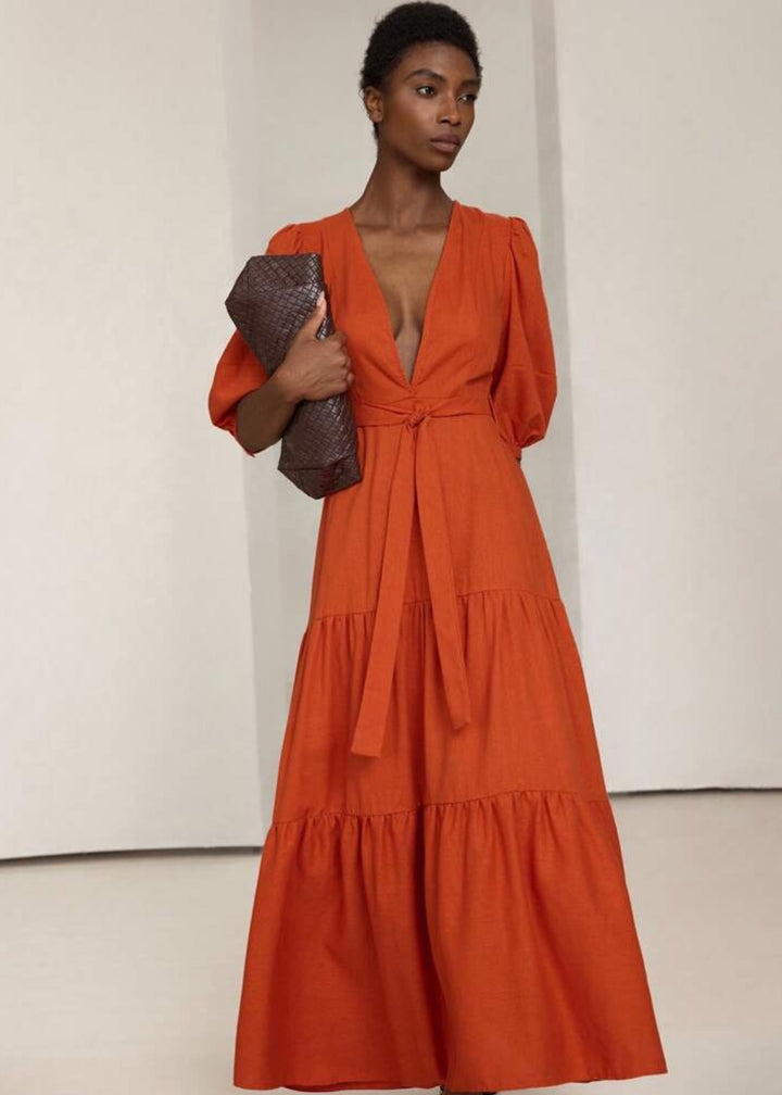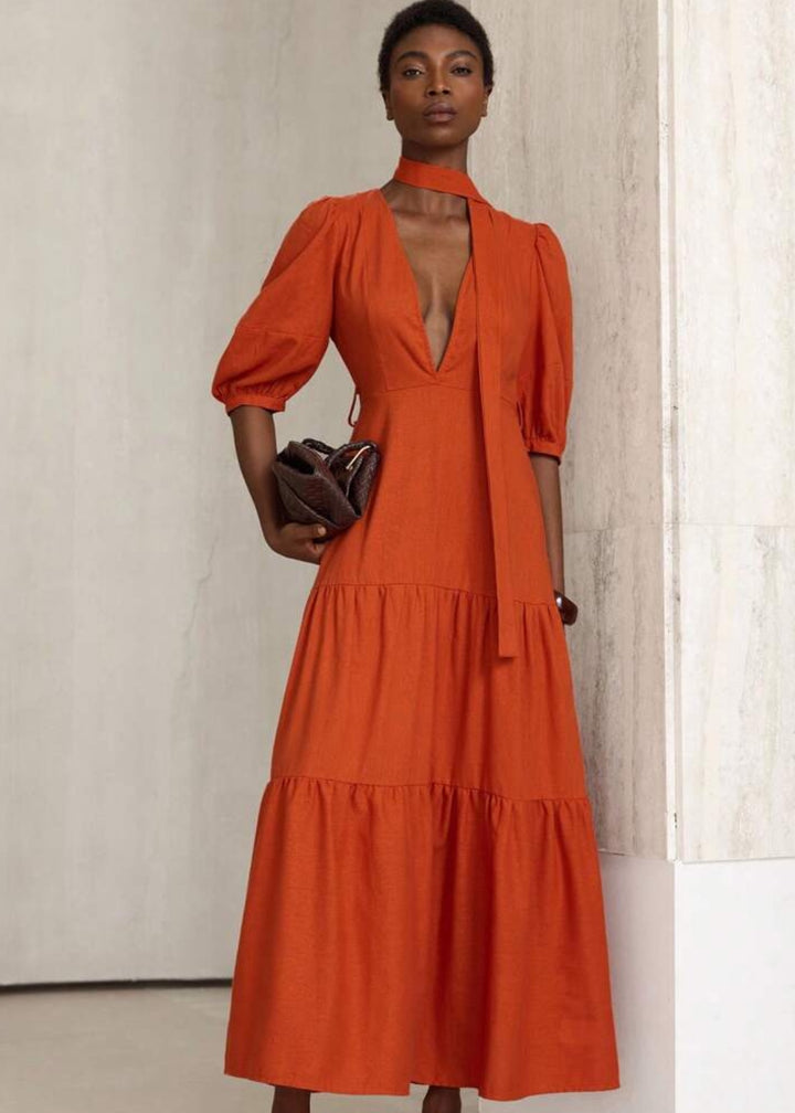 This maxi dress is a perfect blend of a relaxed silhouette and sophisticated details. It features a plunging V-neckline and a front tie closure at the waist, allowing for a personalized, flattering fit. The three-quarter puff sleeves add a touch of volume and style, while the tiered skirt creates a flowy, graceful movement. This is a versatile piece for a range of occasions, from a casual outing to a garden party.