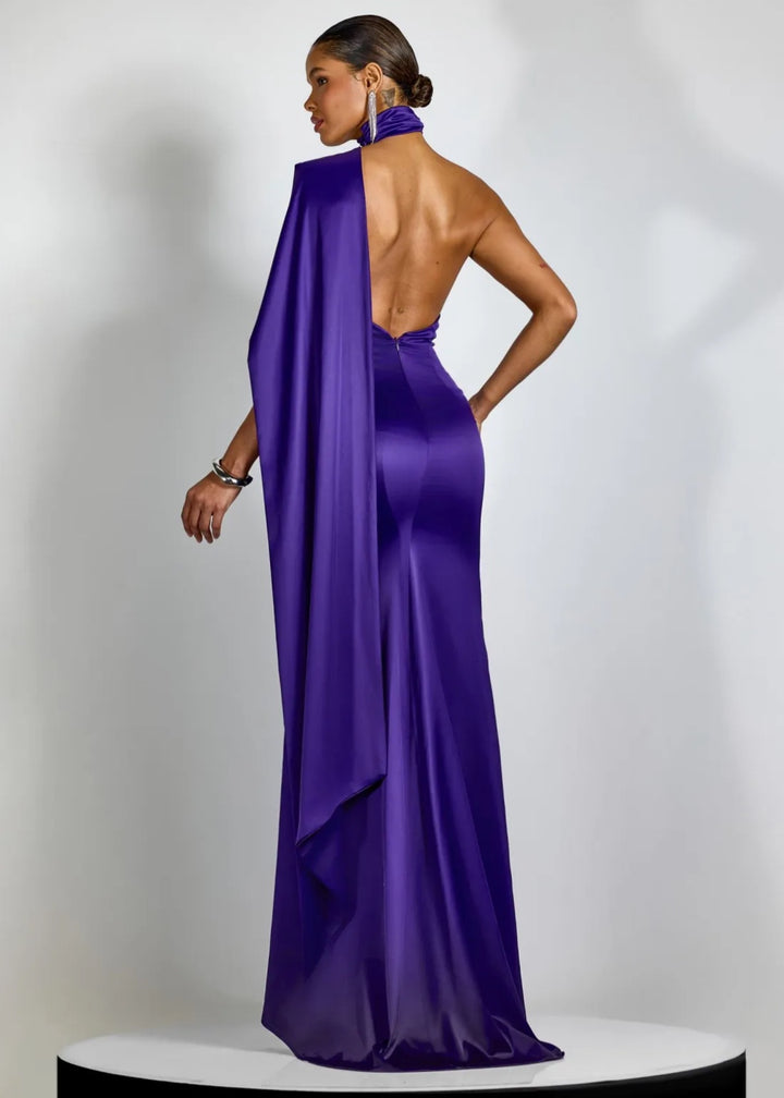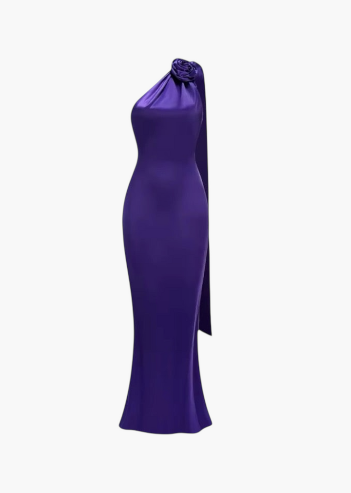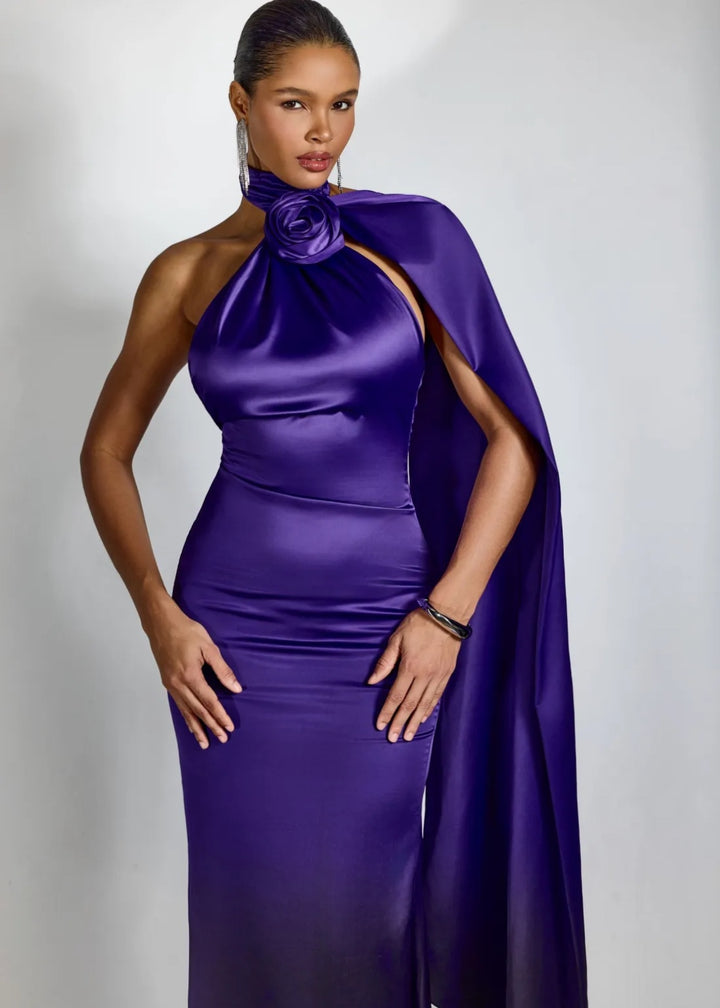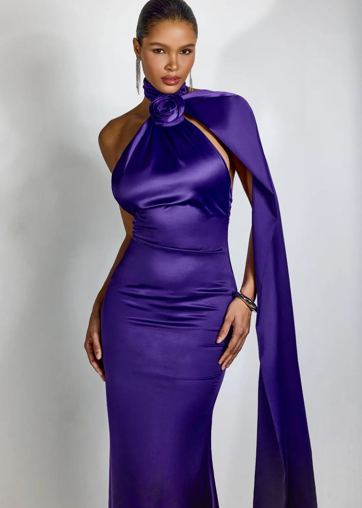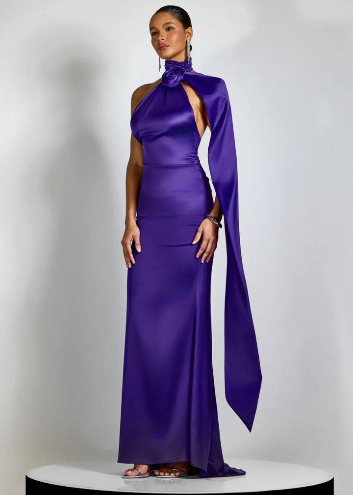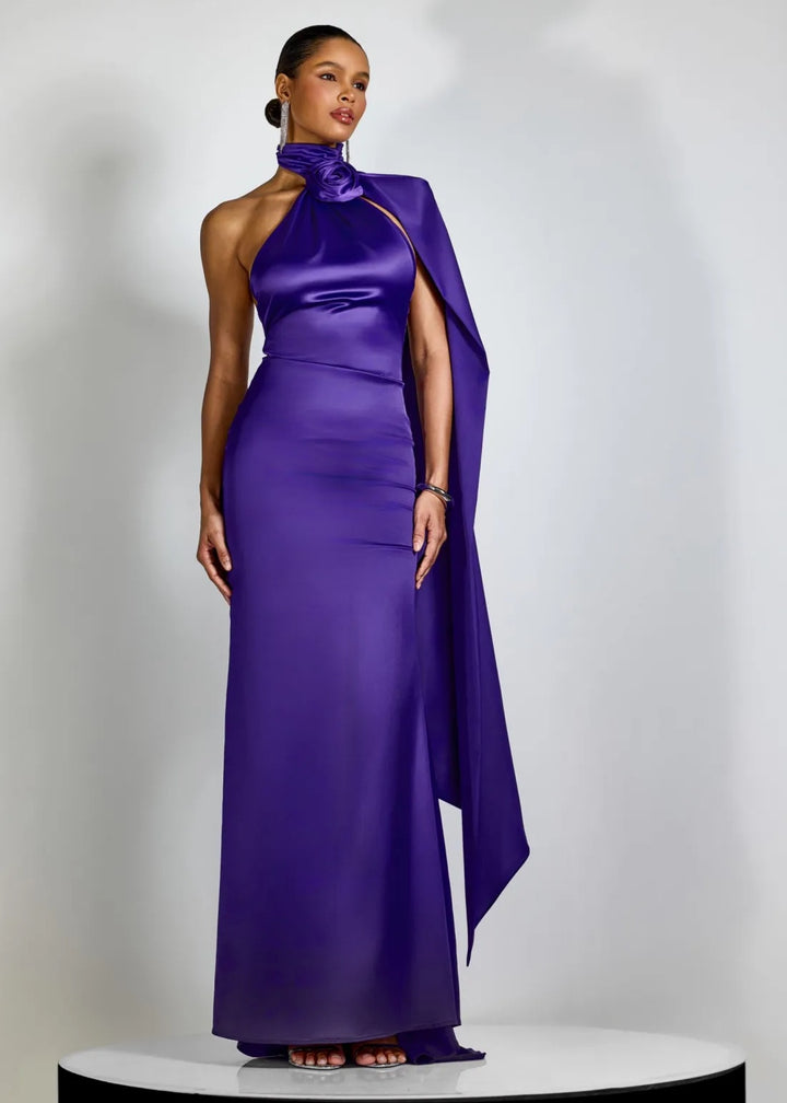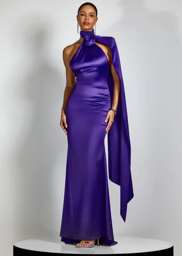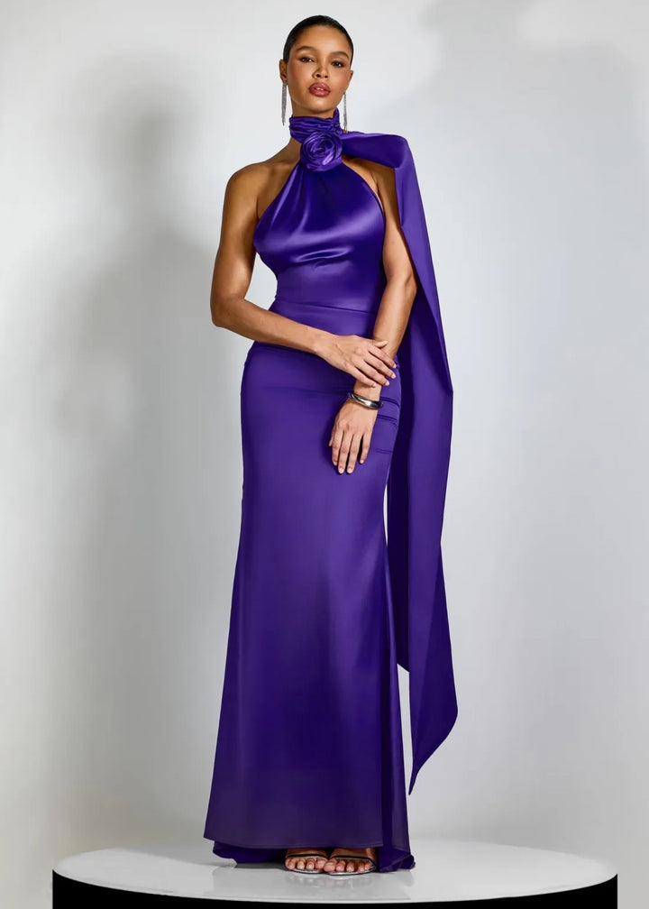 This striking evening gown features a high halter neckline with a draped bodice. A large, three-dimensional rose applique is positioned at the neck, creating a sculptural focal point. A flowing cape detail extends from the shoulder, adding dramatic movement and elegance. The gown has a fitted silhouette that gracefully falls to a floor-length hem. The back is open, secured with a hidden zipper closure for a sleek finish. This piece is an exquisite choice for galas, formal events, or any occasion that demands a sophisticated and memorable ensemble.