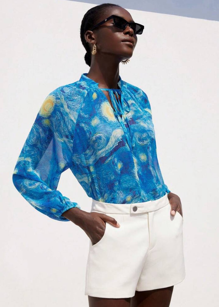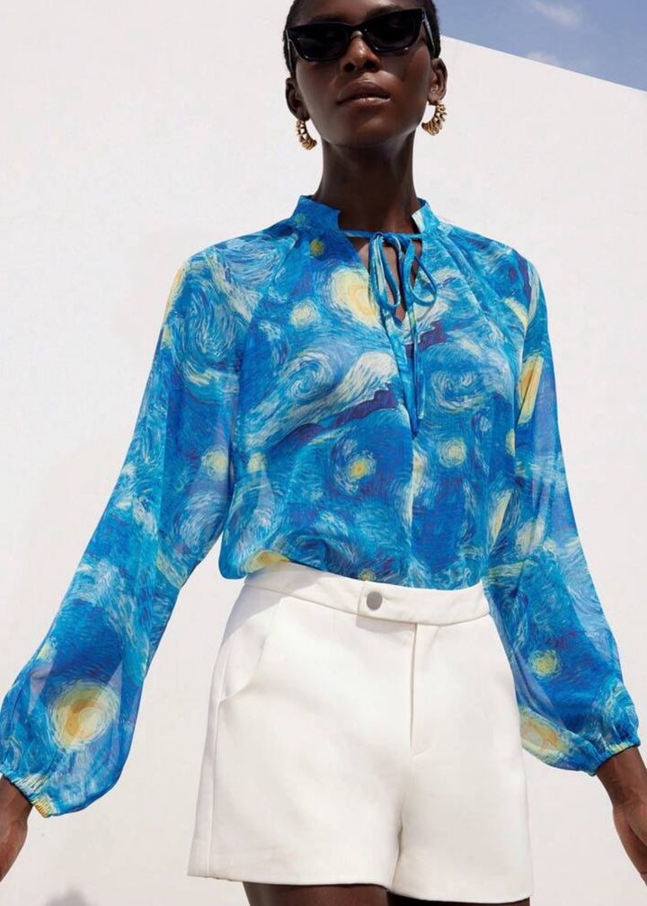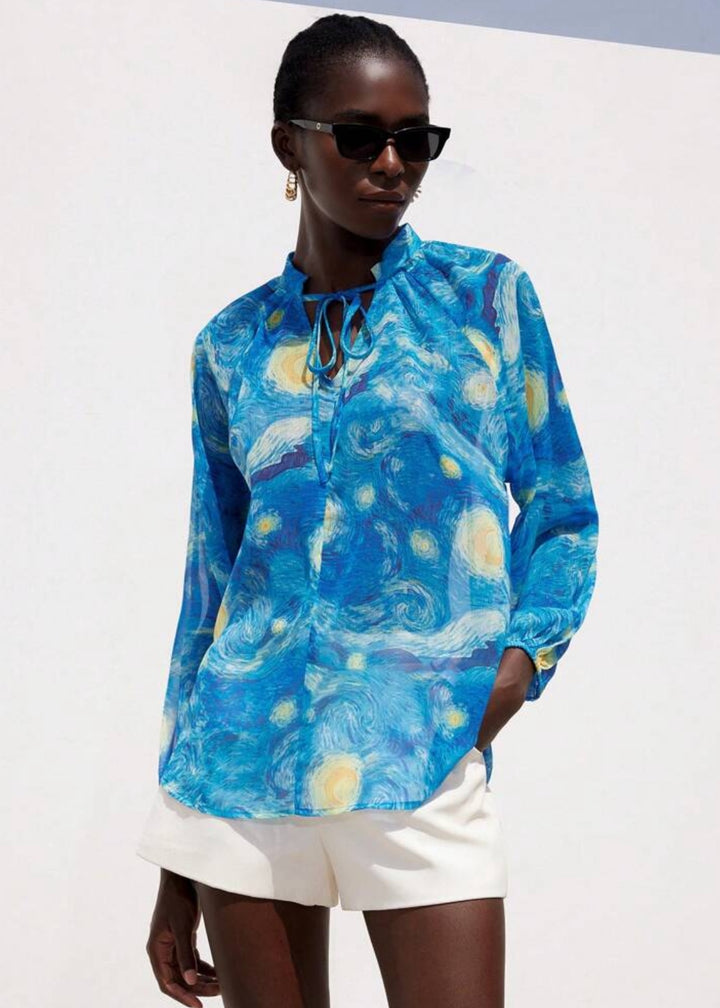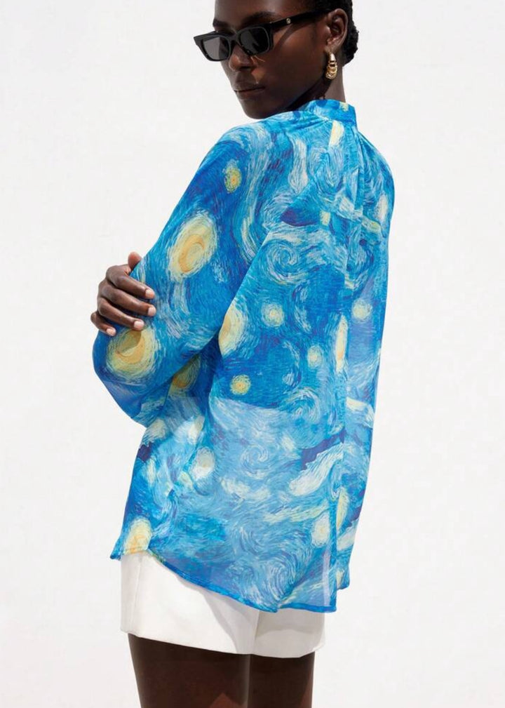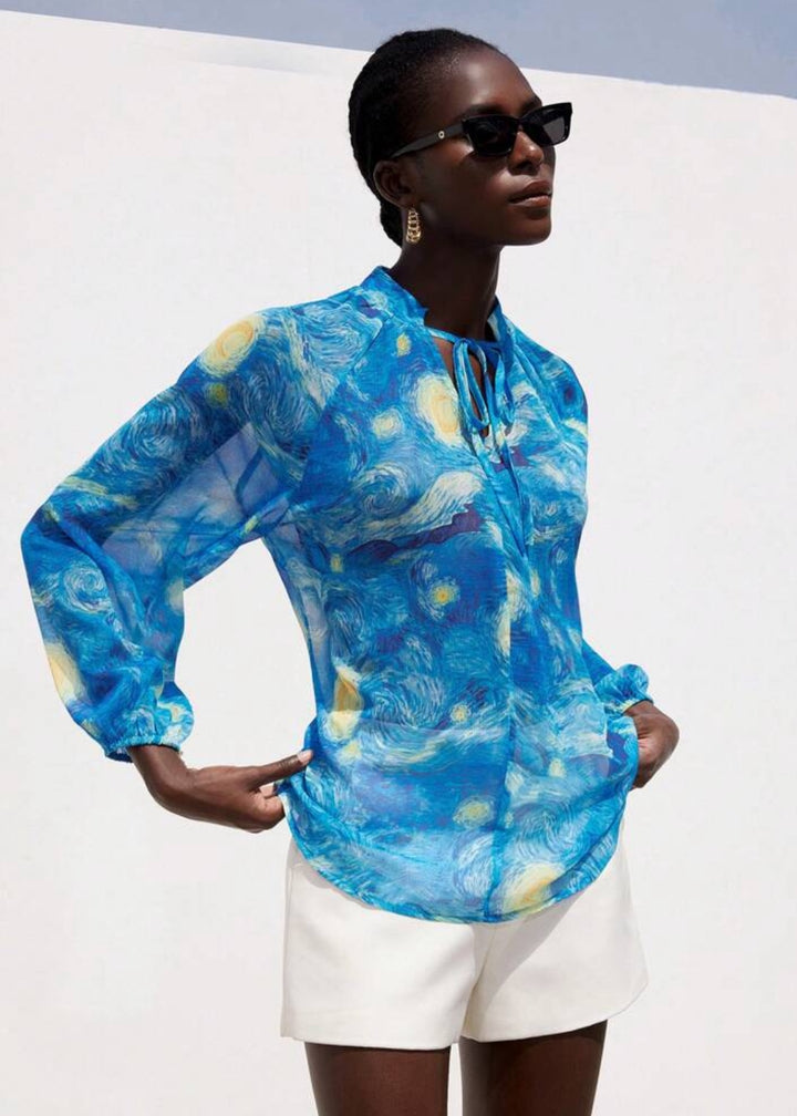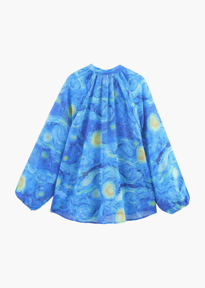 This long-sleeved, high-neck blouse is a wearable work of art, featuring a pattern inspired by a famous painting of a swirling night sky. The fabric is light and sheer, draping gently for a relaxed, oversized fit that is both comfortable and effortlessly stylish. The neckline gathers into soft pleats, while the cuffs are cinched with elastic, creating a subtle balloon-sleeve effect.