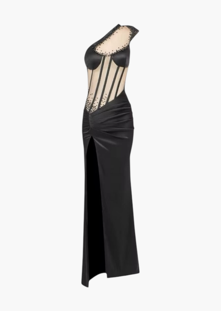 This dramatic maxi gown features an asymmetrical one-shoulder neckline with sheer mesh detailing extending down the bodice, creating a corset-like illusion with strategically placed embellishments. The skirt is gathered at the hip, cascading into a flowing silhouette with a high side slit. The combination of textures and intricate design makes this gown a captivating choice for special occasions.