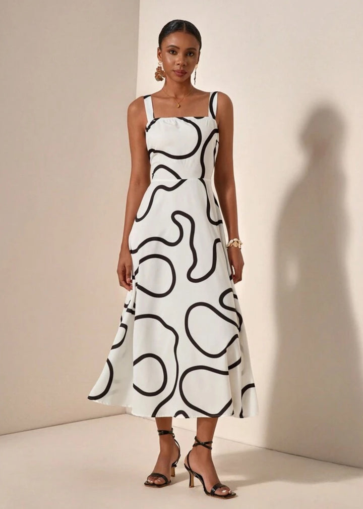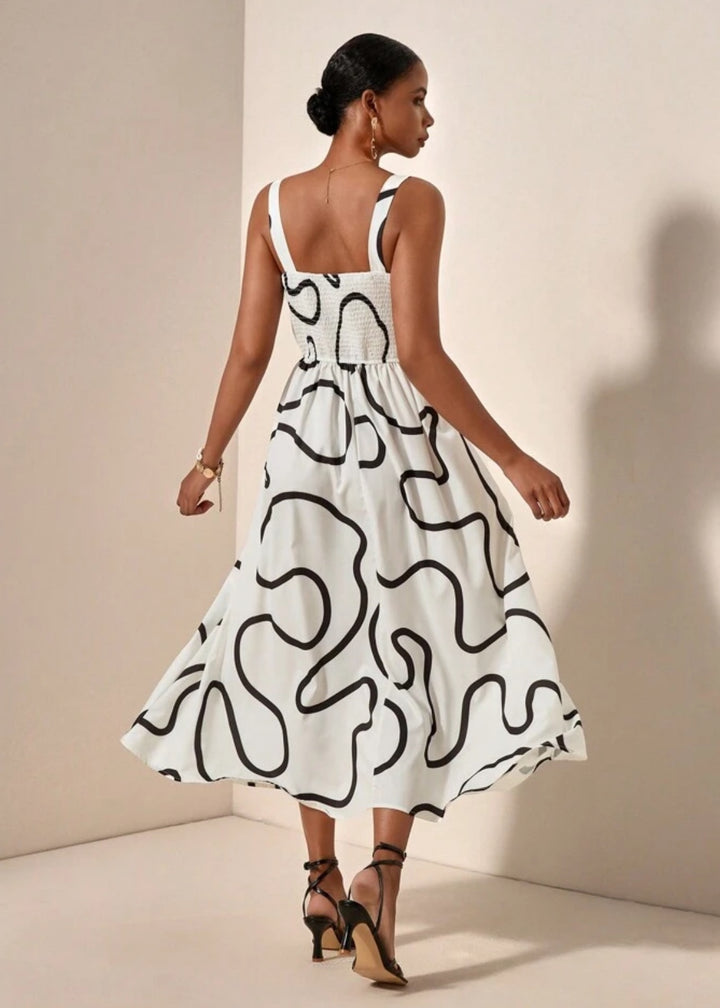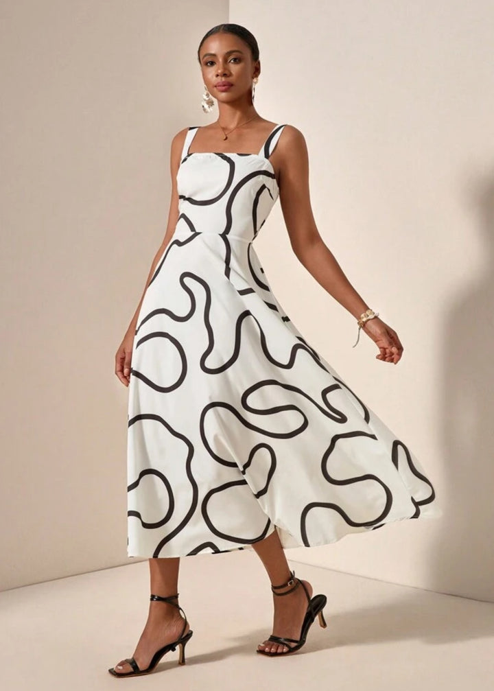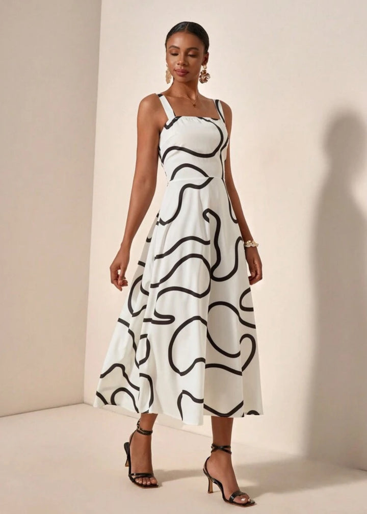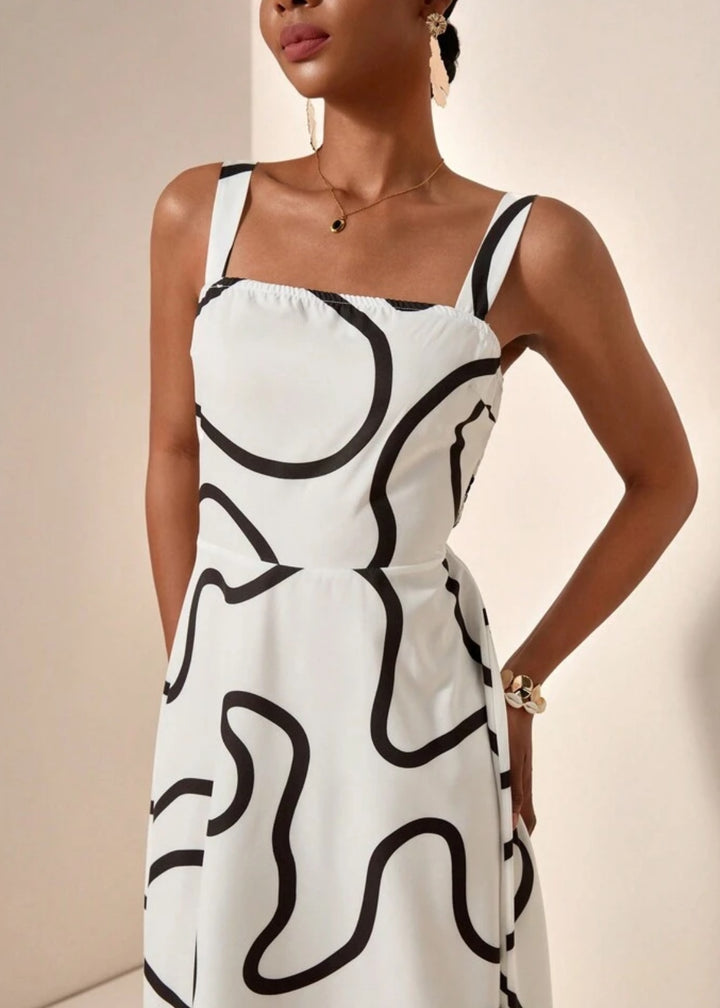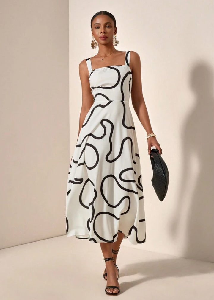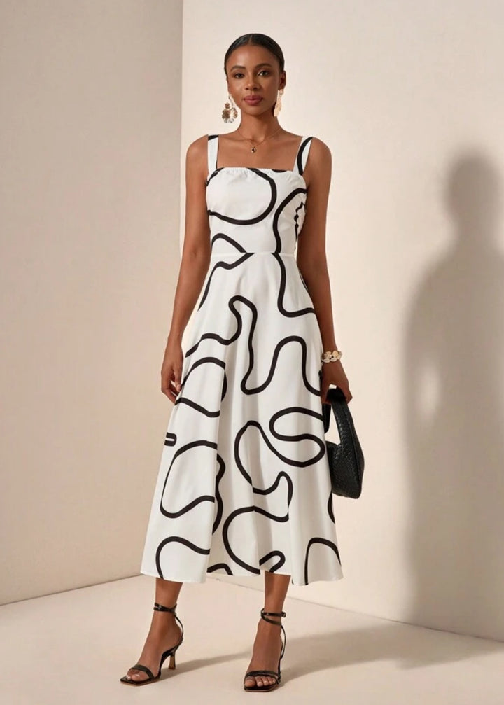 This midi dress offers a contemporary and artistic flair with its striking abstract line pattern. It features a clean square neckline and wide, comfortable shoulder straps, creating a sleeveless design perfect for warmer weather. The dress is fitted through the bodice and flares out into a flowing midi-length skirt, offering a flattering A-line silhouette. The bold, winding line pattern provides a unique visual interest, making this dress a standout piece for various occasions. Crafted from a lightweight, breathable fabric, it ensures both style and comfort.