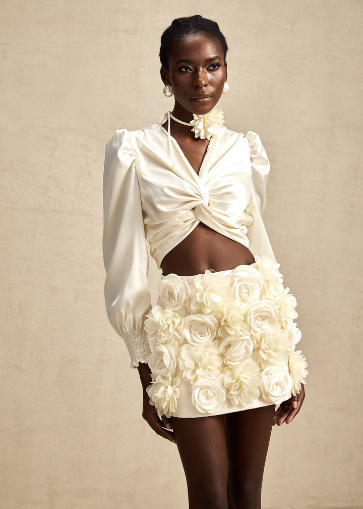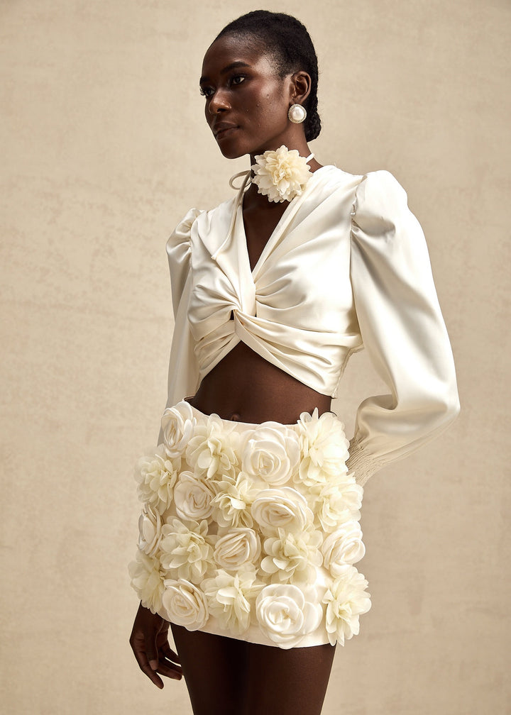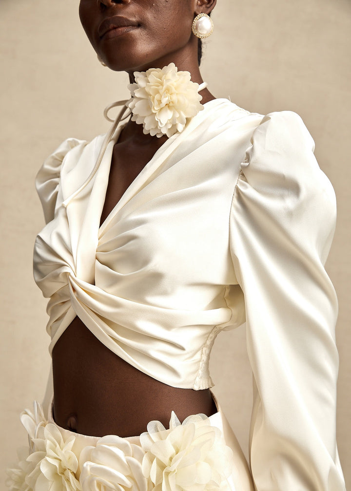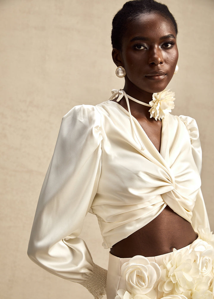 This sophisticated blouse features a deep V-neckline with a central twisted detail, creating a draped and flattering fit. The design includes long sleeves with voluminous puff shoulders and delicate smocked cuffs and hem, adding a touch of romance and structure. The cropped length of the blouse makes it ideal for pairing with high-waisted bottoms, while a concealed side zipper ensures a smooth finish. The blouse is accompanied by a thin tie that can be worn as a neck choker, featuring a three-dimensional floral applique for an extra styling detail. This piece is perfect for a glamorous night out, a special dinner, or any event where you want to make a chic statement.