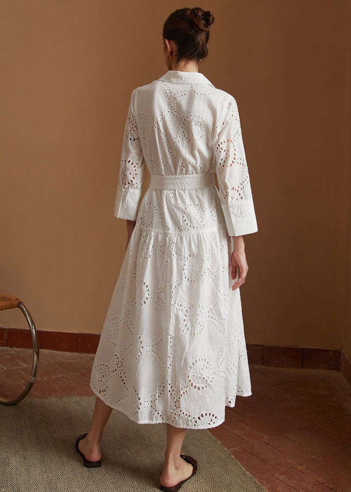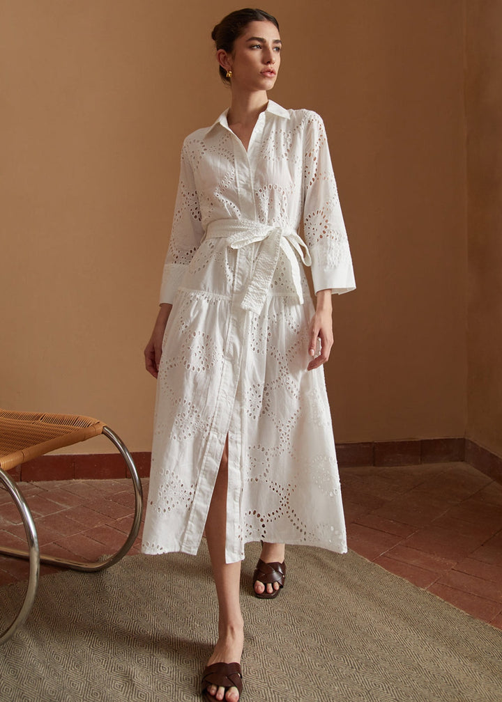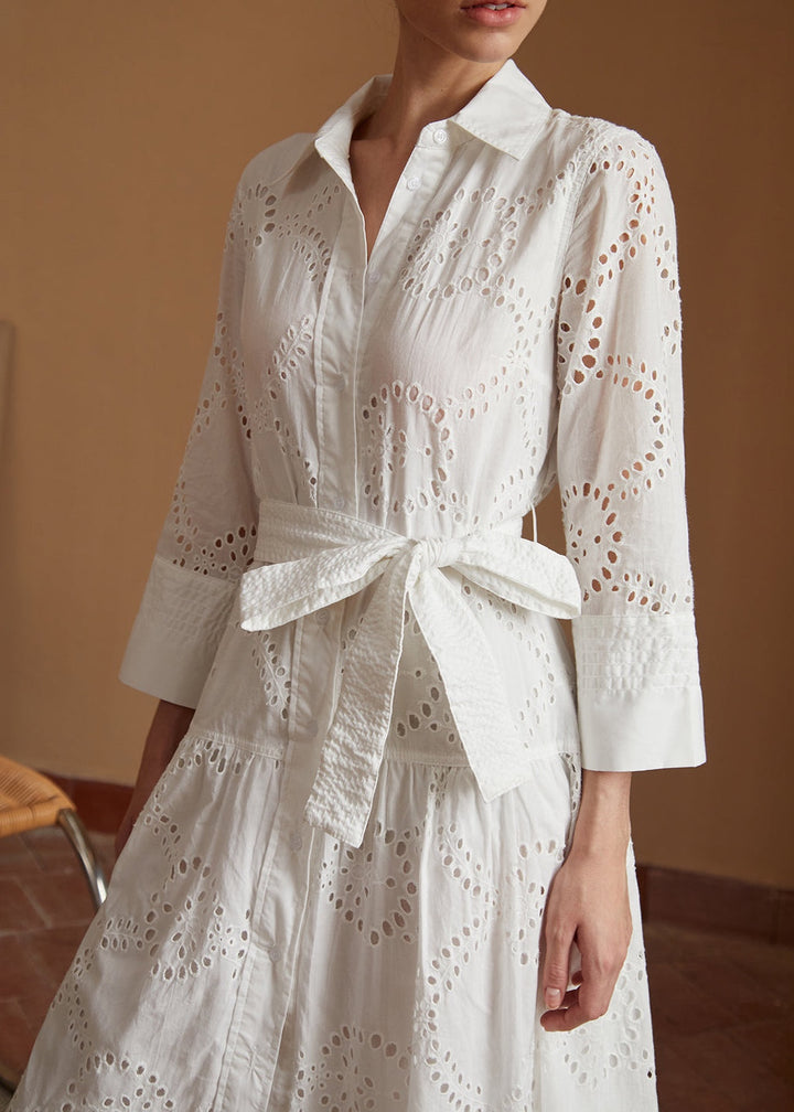 This elegant midi-length shirt dress is crafted from a breathable cotton fabric, featuring intricate eyelet embroidery throughout. The design showcases a classic collar and a full-button placket extending down the front, allowing for versatile styling. A detachable self-tie belt cinches the waist, creating a flattering silhouette, while the long sleeves can be rolled up and secured with button tabs for a more relaxed look. The skirt flows gracefully, adorned with tiered eyelet detailing, adding to its artisanal charm.