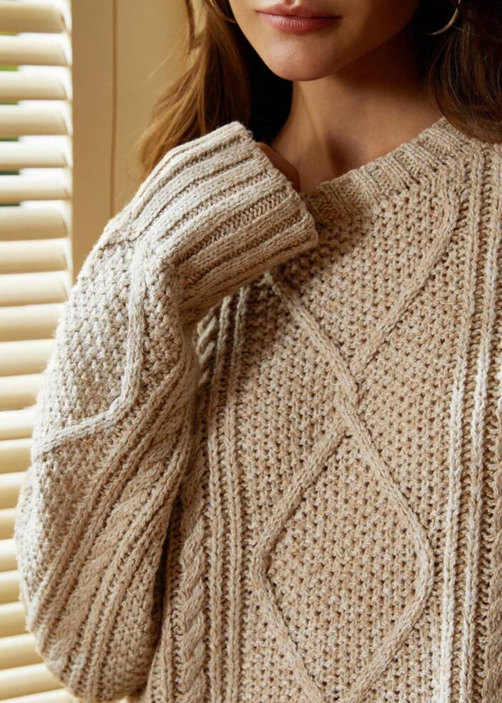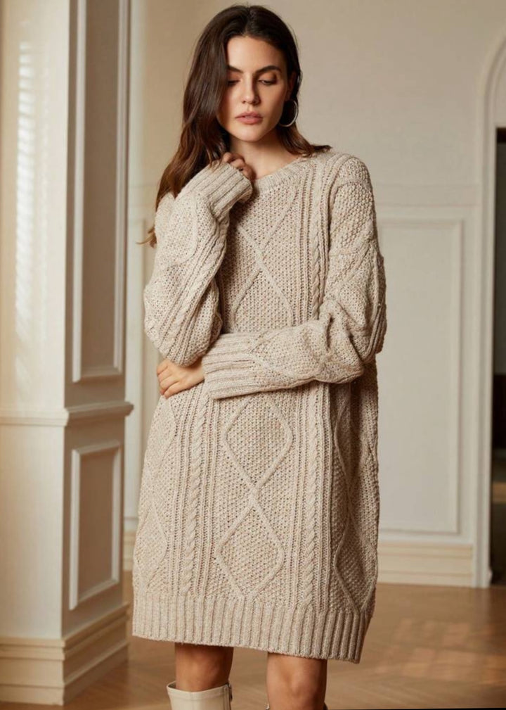 This knit mini dress is a comfortable and stylish addition to any wardrobe, featuring a classic crew neck and a relaxed fit.The dress is adorned with an all-over cable knit pattern, providing rich texture and visual interest. Its mini length makes it versatile for various styling options, perfect for cooler weather.
