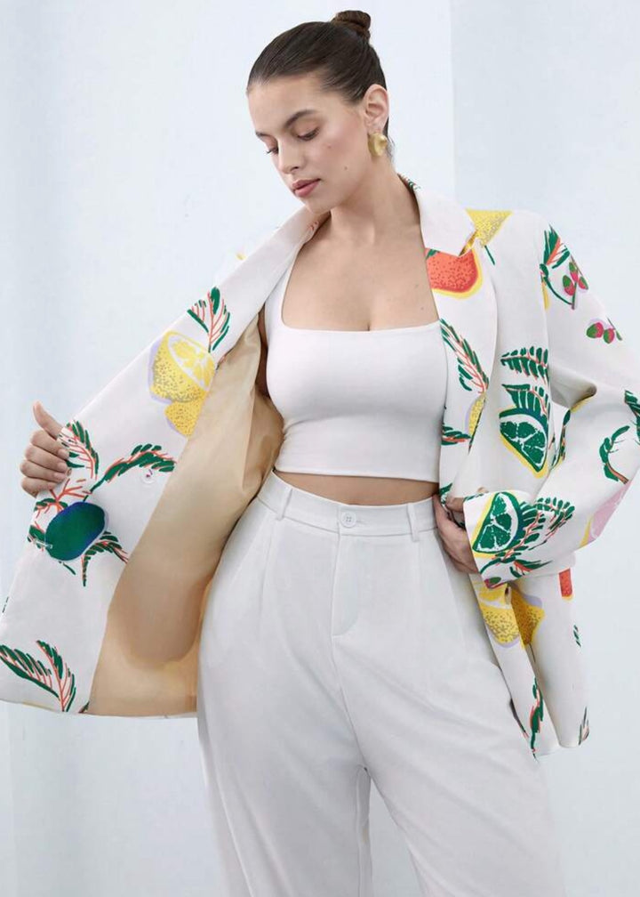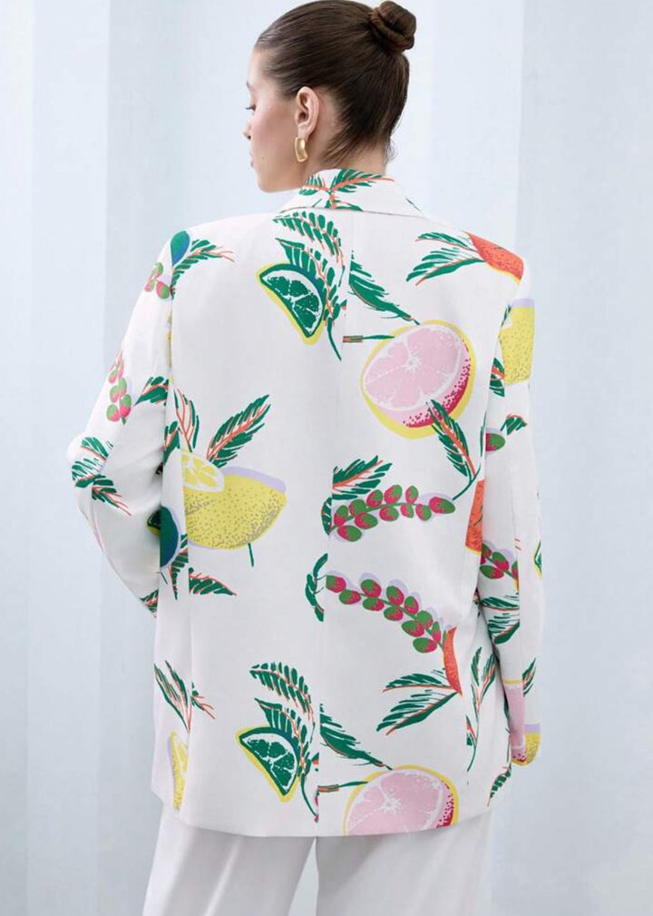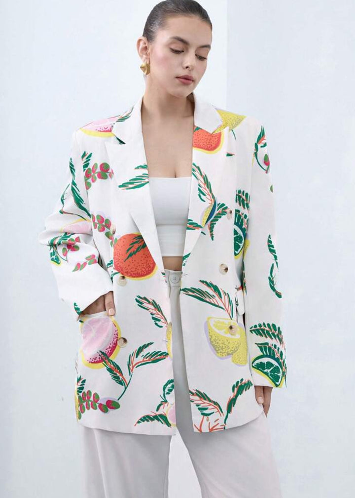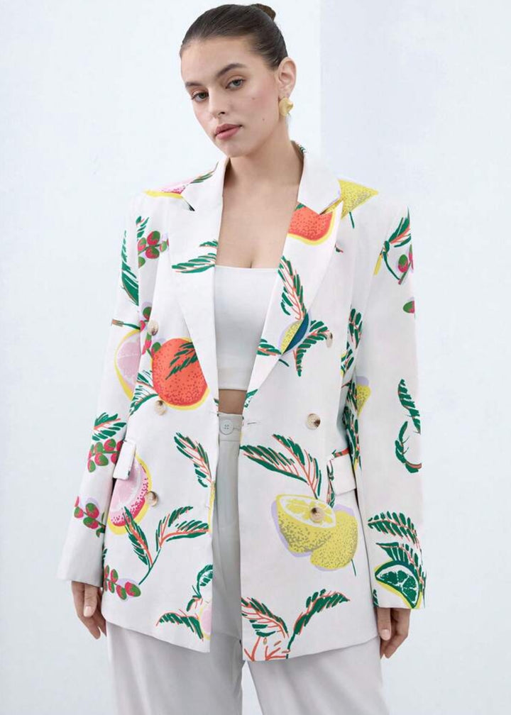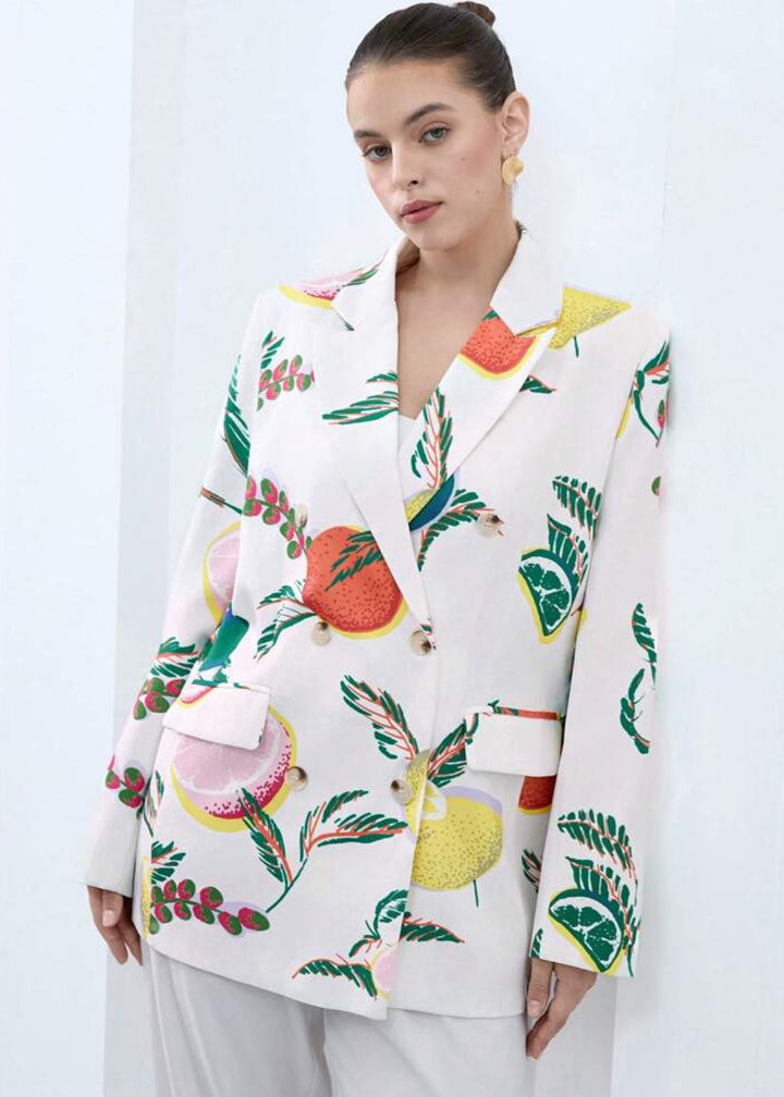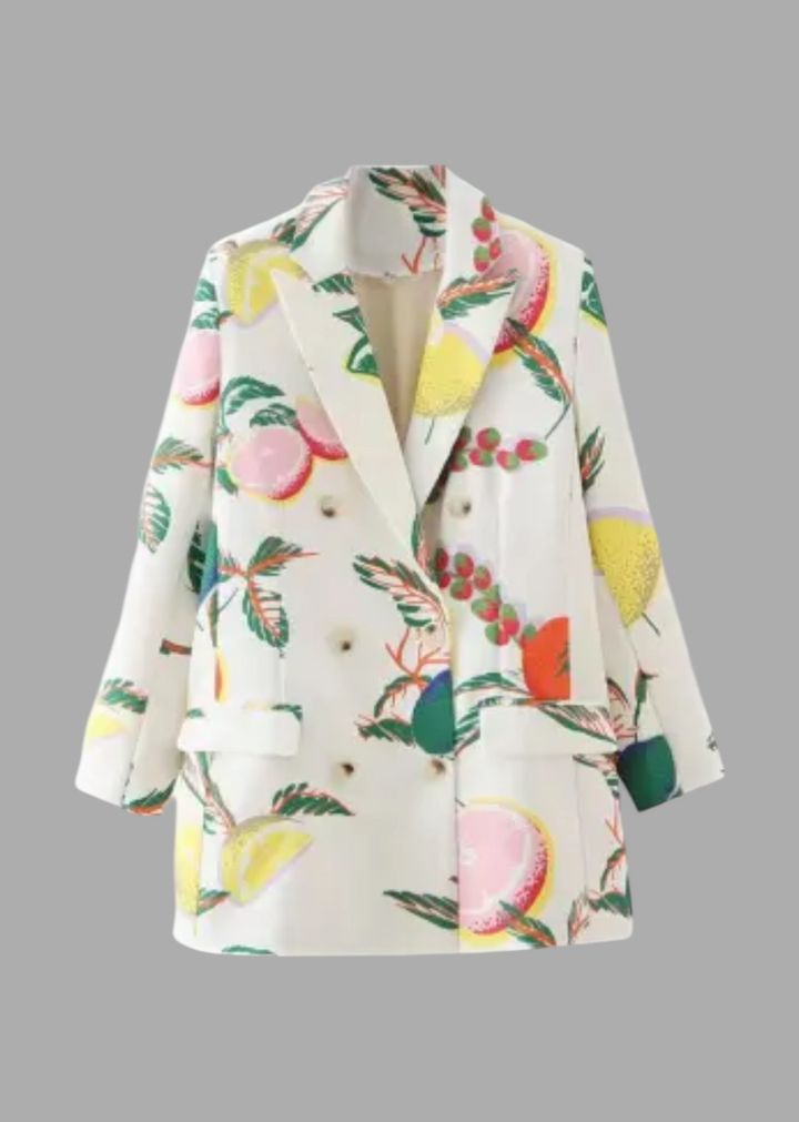 This statement blazer features a vibrant all-over fruit and foliage print. It has a classic double-breasted silhouette with a notched lapel and structured shoulders. The blazer is a tailored fit, including front flap pockets and a button closure at the front. It is a bold and playful piece that can elevate any outfit.