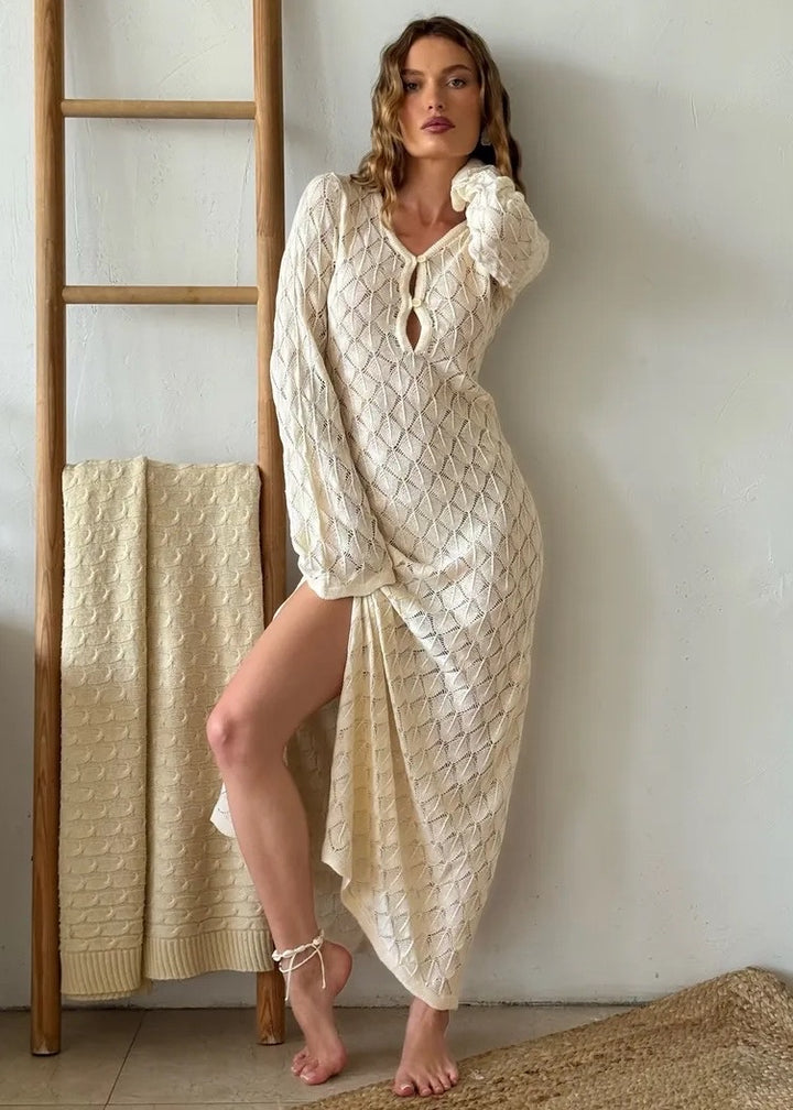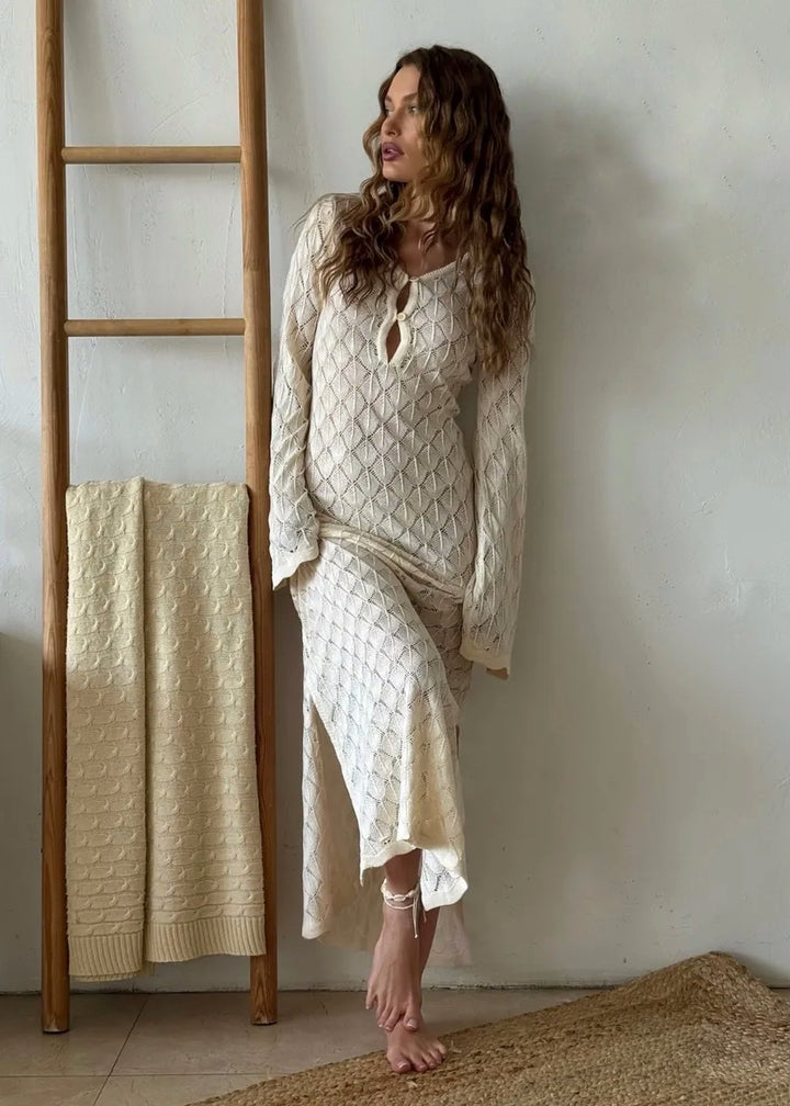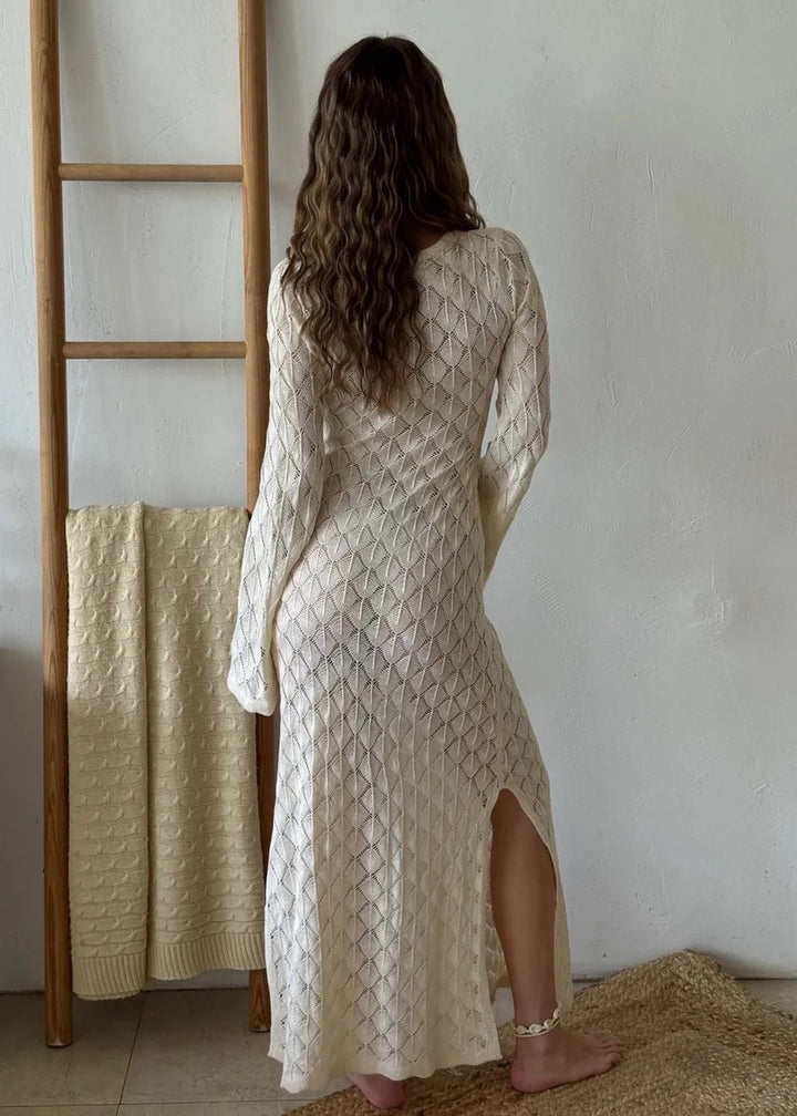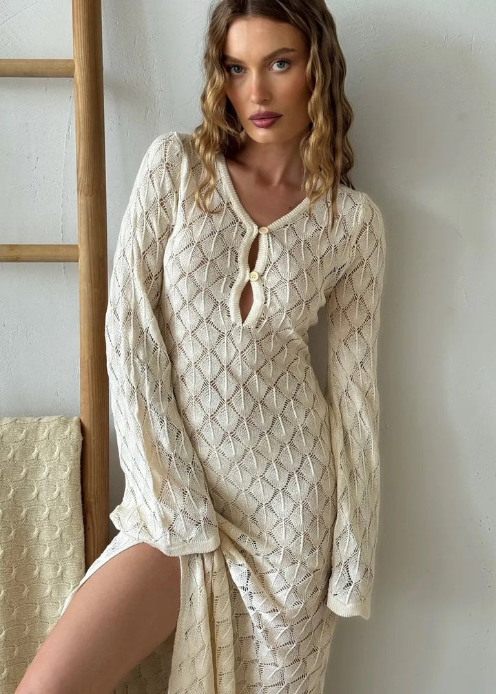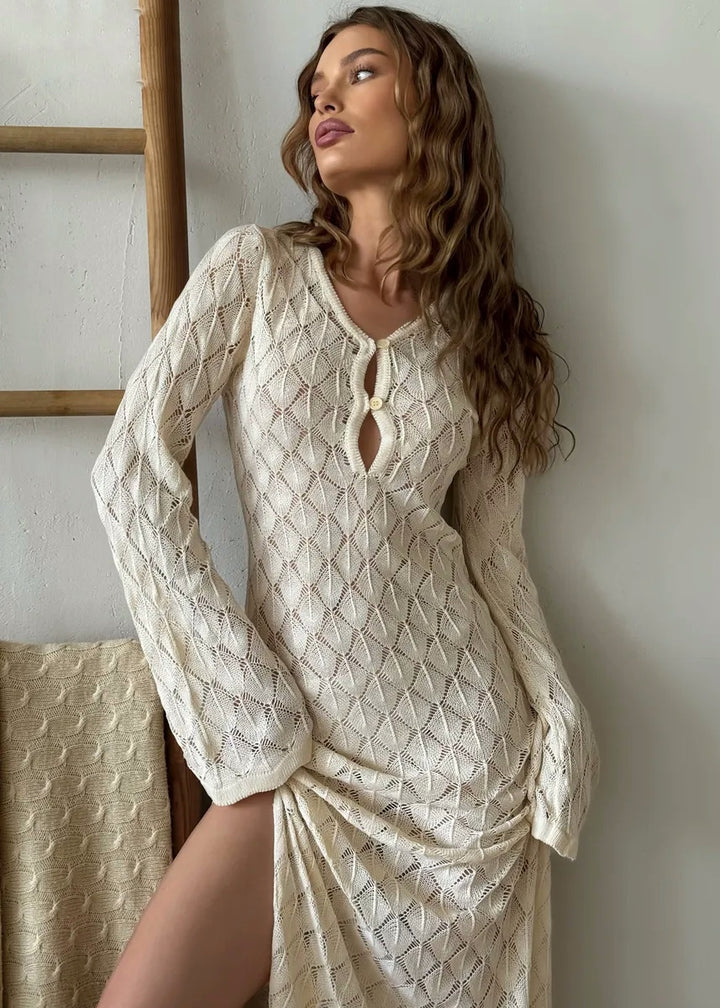 Introducing the Textured Knit Maxi Dress with Button Placket Detail, a beautifully designed dress that combines sophistication with comfort. This piece features a unique textured knit that offers both warmth and breathability, making it suitable for various occasions. The flattering long sleeves and a keyhole button placket at the neckline add a touch of elegance, while the side slit enhances mobility and style.