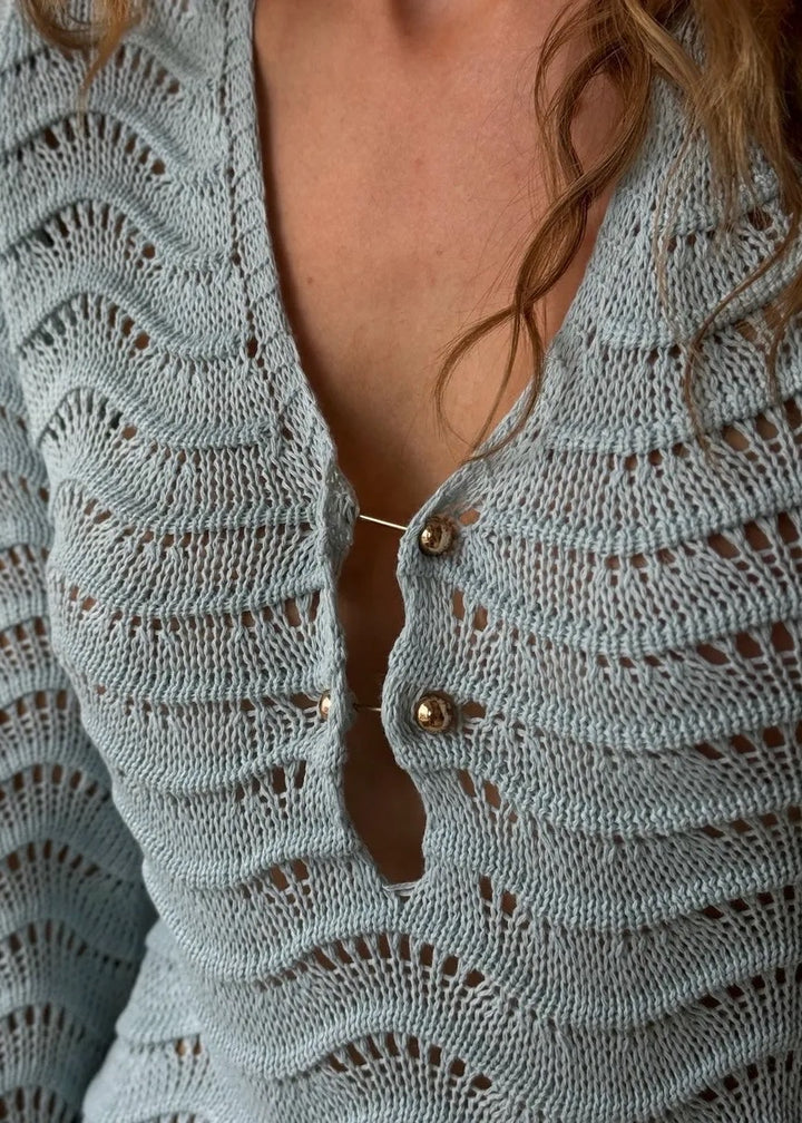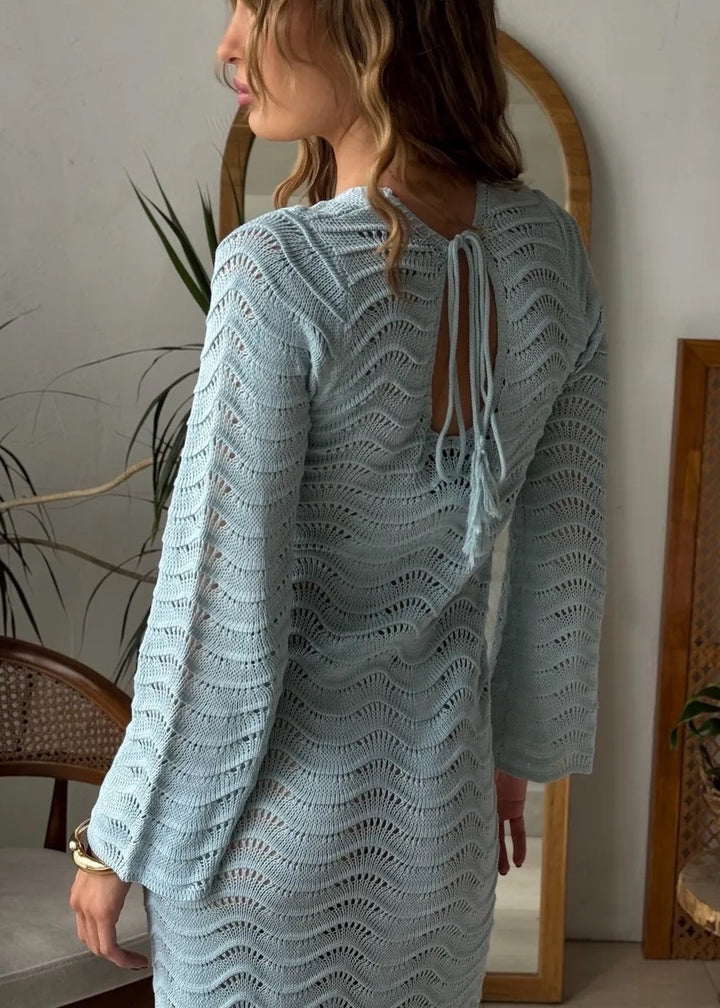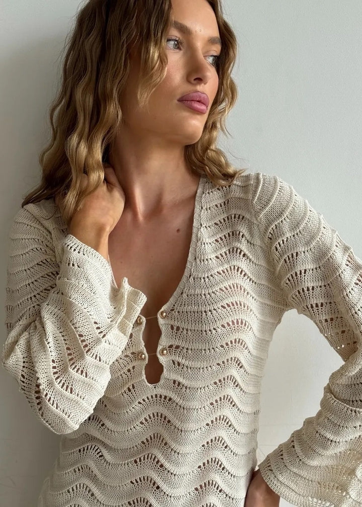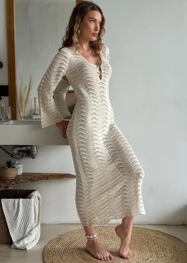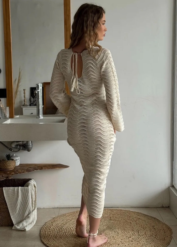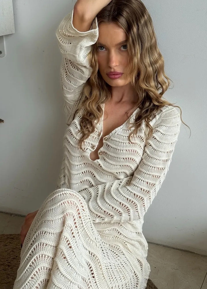Introducing the Woven Crochet Maxi Dress with Tie Back, a stunning piece that combines intricate craftsmanship with a flattering silhouette. This dress features a beautiful woven pattern that enhances its unique style. The deep V-neckline is adorned with decorative buttons, adding a touch of charm, while the long sleeves provide an elegant flow. The back tie closure not only offers a secure fit but also creates an eye-catching detail.