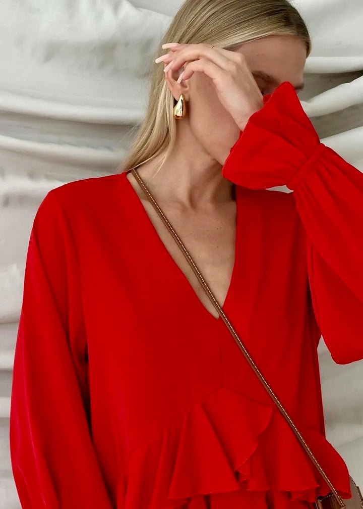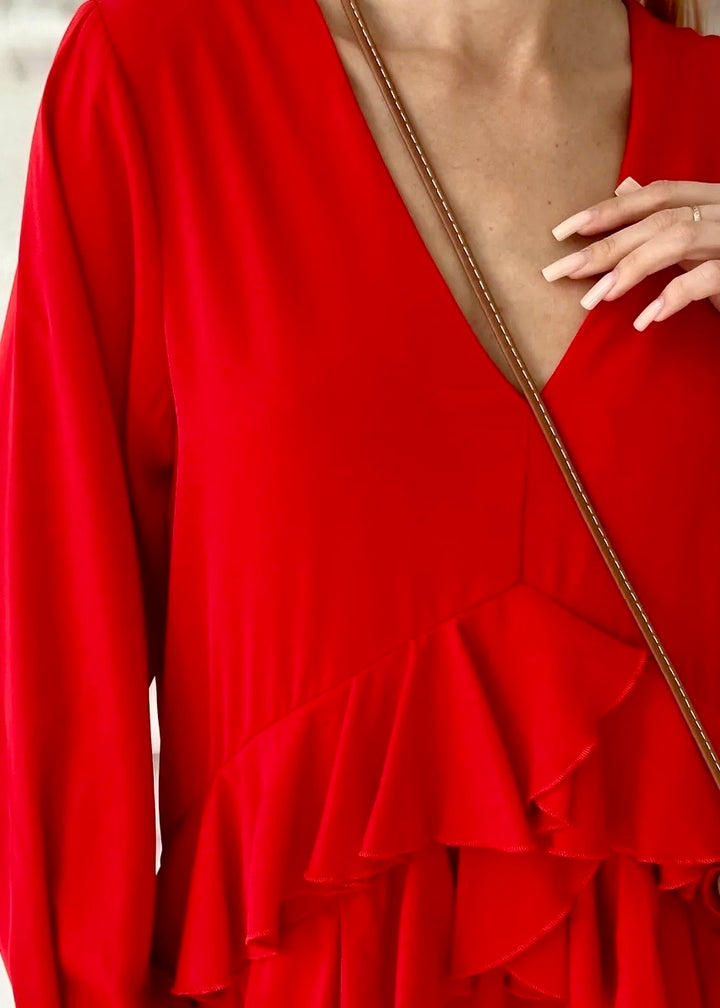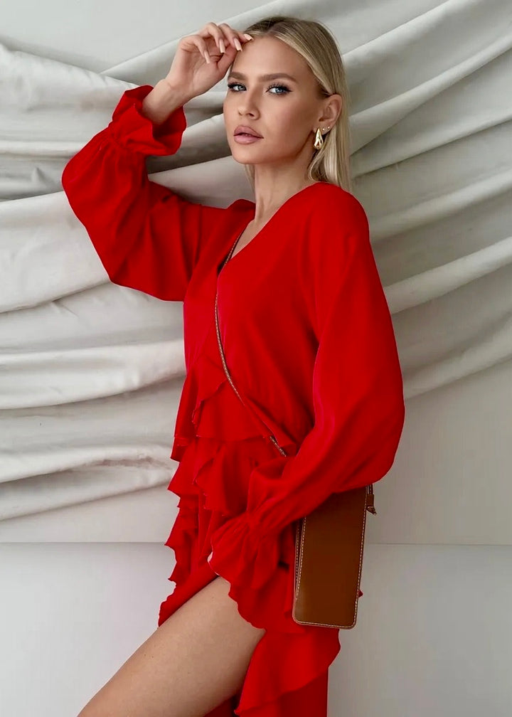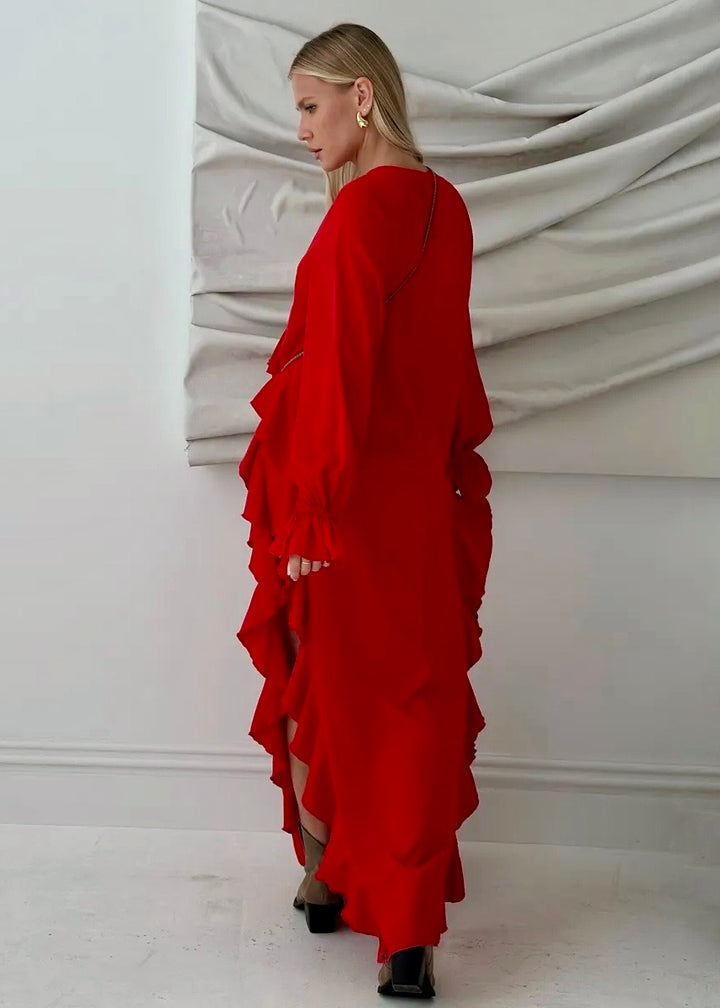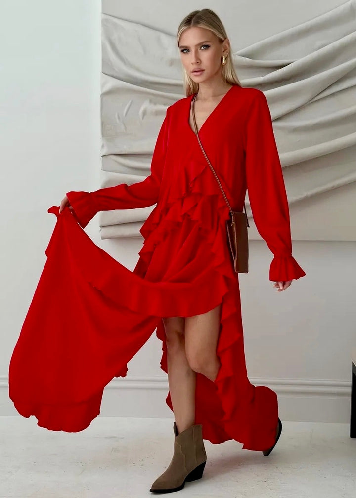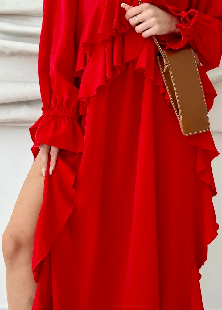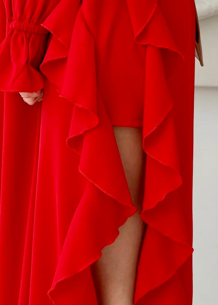 Introducing the Ruffled Maxi Dress with Side Slit, a perfect blend of elegance and style. This dress features a deep V-neckline and long sleeves, providing a sophisticated silhouette. The cascading ruffles along the front add a playful touch, while the side slit offers a glimpse of leg for a striking effect. Ideal for both daytime events and evening outings, this dress ensures you stand out.