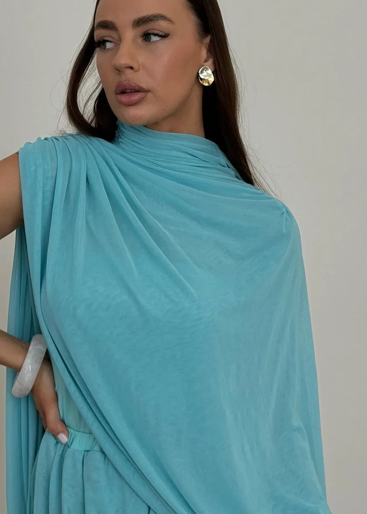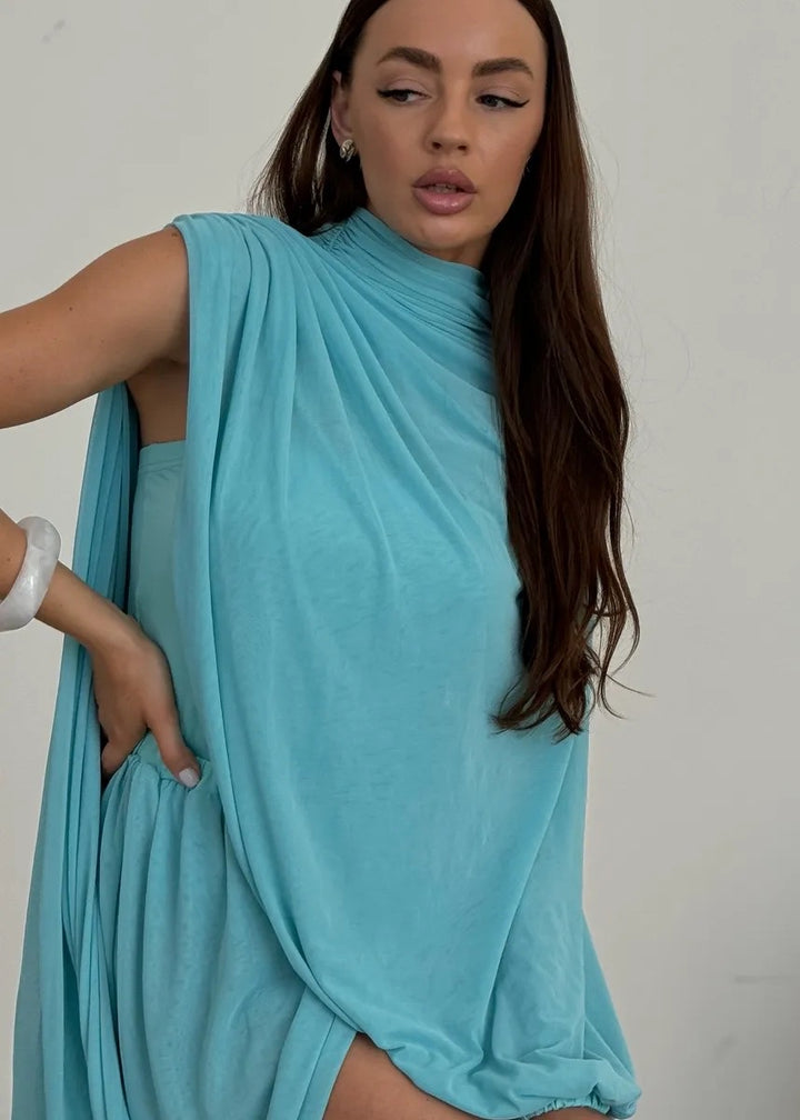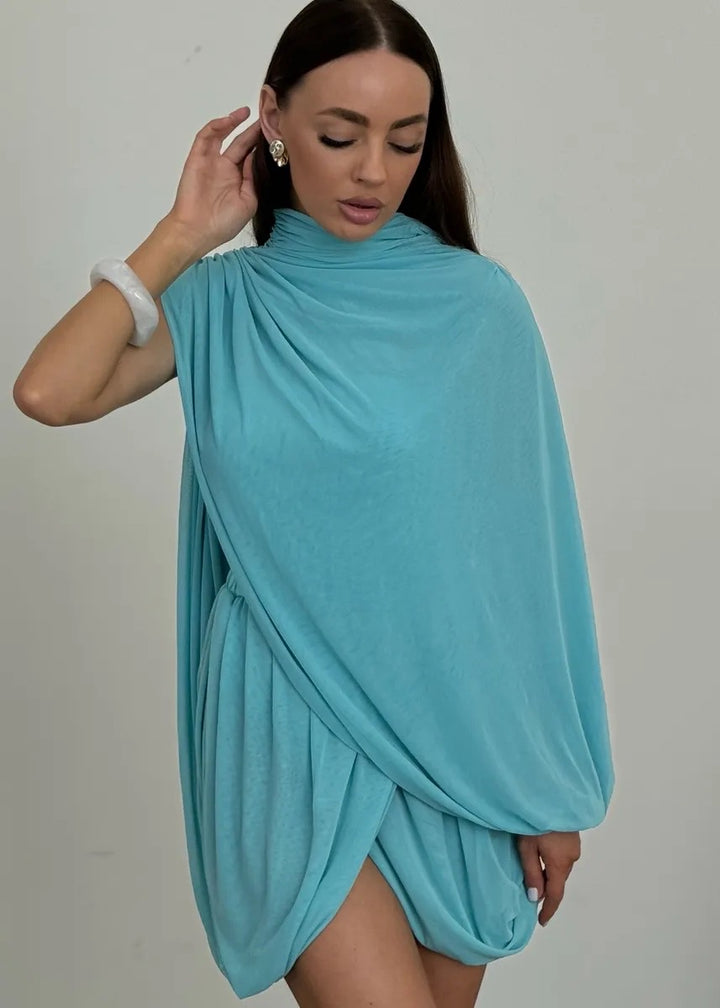 Elevate your wardrobe with this uniquely structured one-shoulder draped cowl overlay mini dress, designed to make a bold statement with minimal effort. This standout piece features a high neckline and an asymmetrical silhouette that cascades gracefully over the body, offering a flowy, sculptural look that blends modern minimalism with Grecian-inspired elegance.