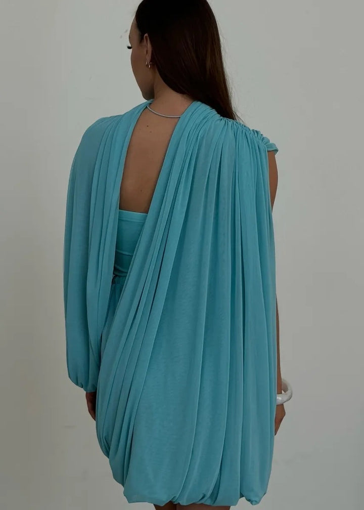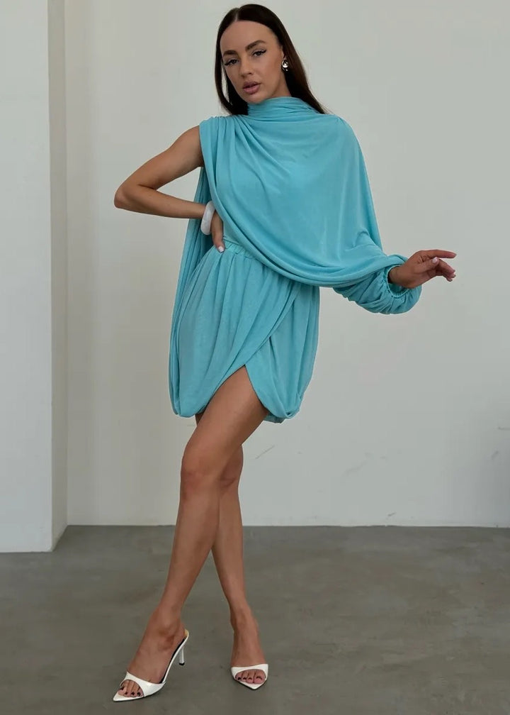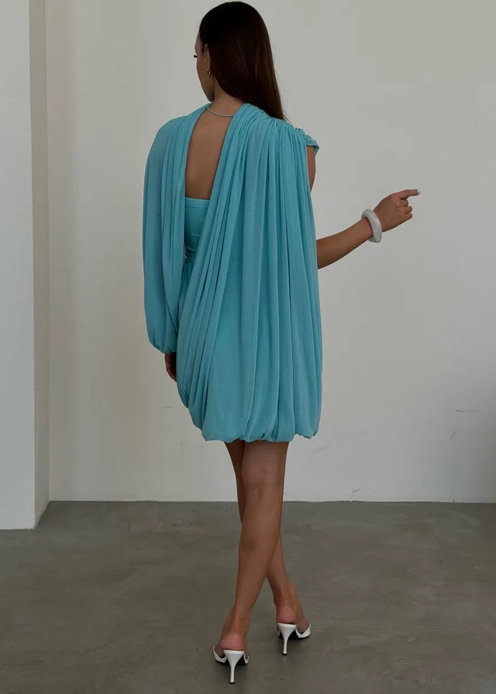 The exaggerated draped overlay creates a layered, cocoon-like structure, while the mini hemline provides contrast through leg-baring femininity. An open-back peek subtly reveals a bandeau-style underlayer, contributing to both style and support. The dress is designed with an elastic waist underneath to help shape the body without compromising the garment’s fluid silhouette.
