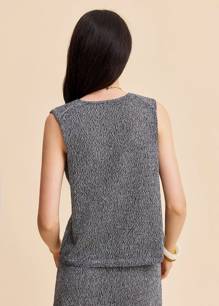 Elevate your warm-weather wardrobe with this stylish sleeveless knit top. Crafted from a comfortable knit fabric, this top features a flattering V-neckline. The unique design element is the front tie closure, which creates an adjustable and cinched effect, adding visual interest to the garment. Its sleeveless silhouette makes it perfect for layering or wearing on its own during warmer days. This top offers a blend of comfort and style, making it a versatile addition to your collection.