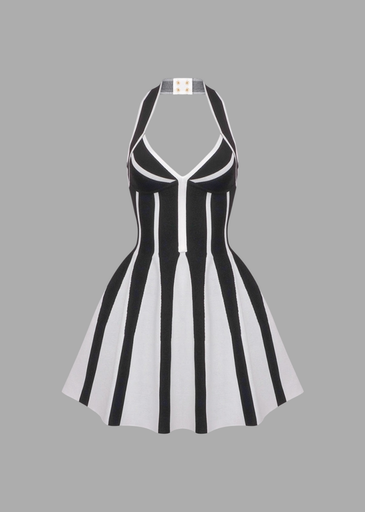 This sleeveless mini dress features a halter neckline that fastens at the back. It has a high-contrast striped pattern that creates a dramatic visual effect, with the lines converging at the bodice. The dress is cinched at the waist and flares out into a full, A-line skirt. The back has a zipper closure for a secure fit.