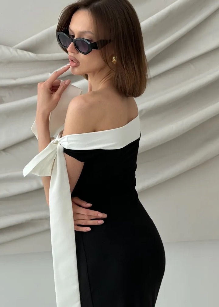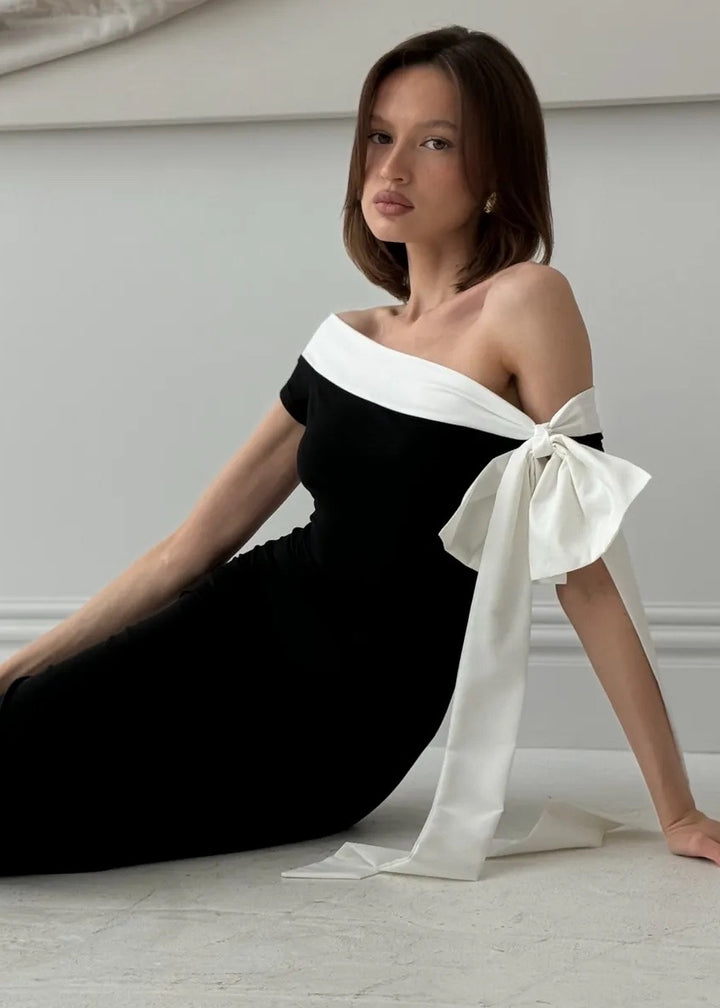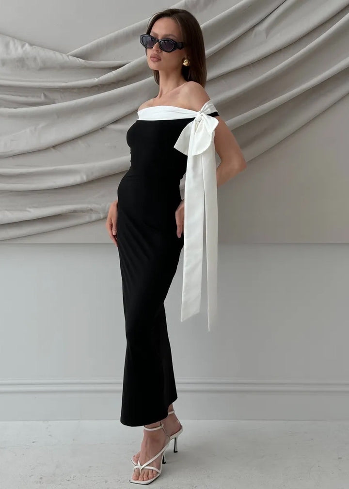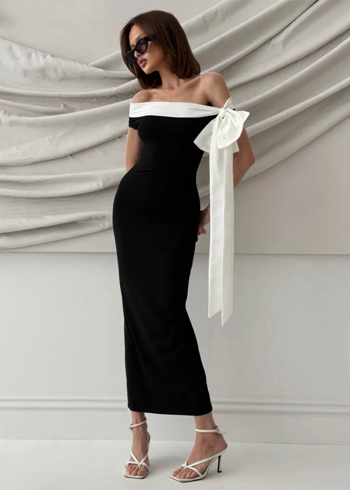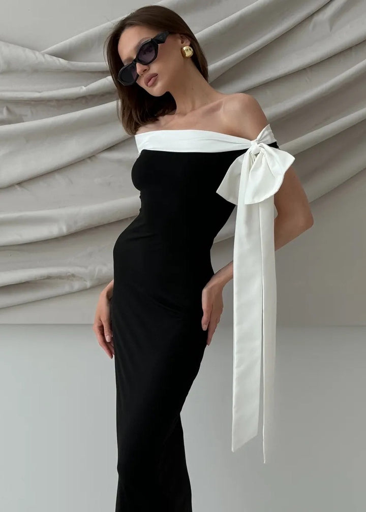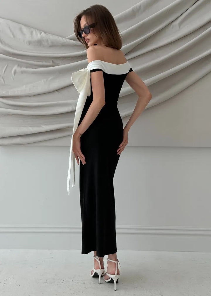 Elevate your wardrobe with the Off-Shoulder Bow Tie Detail Evening Dress, a stunning blend of sophistication and elegance. This exquisite piece features a distinctive off-shoulder design that beautifully showcases the collarbone and shoulders, making it perfect for formal events or special occasions.