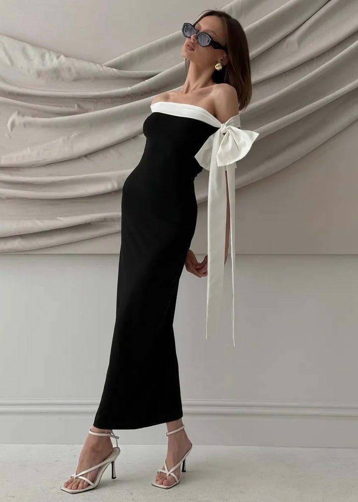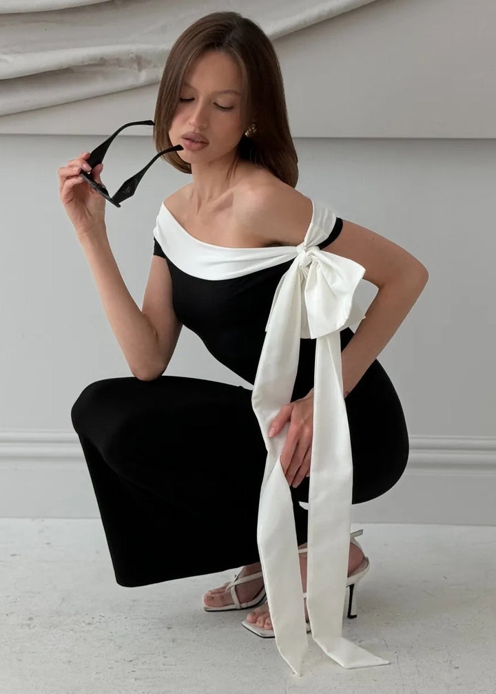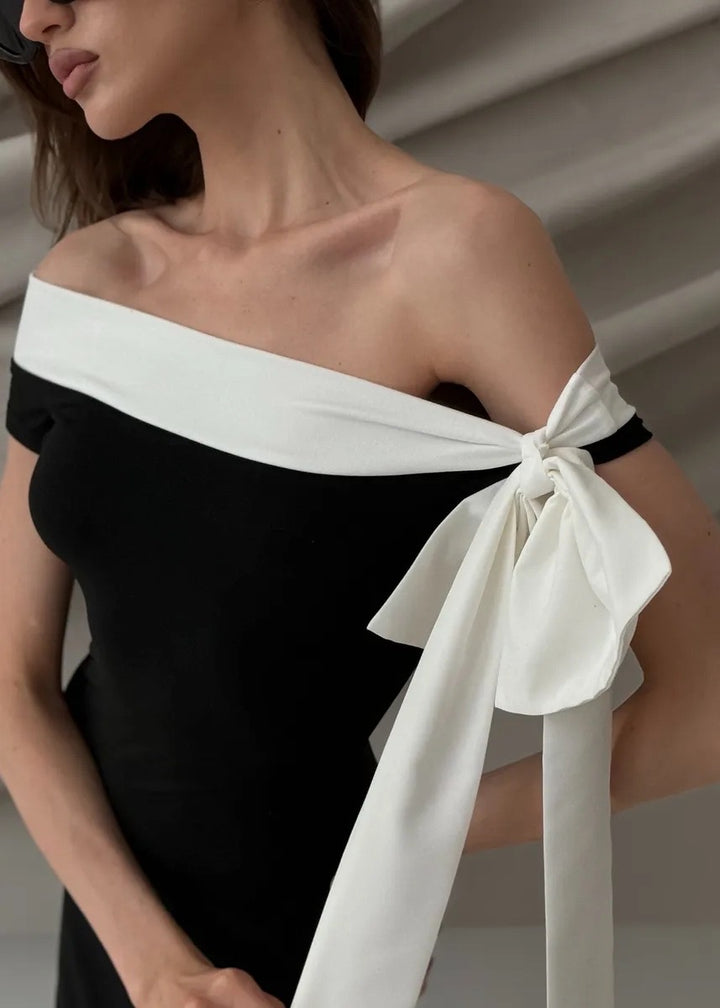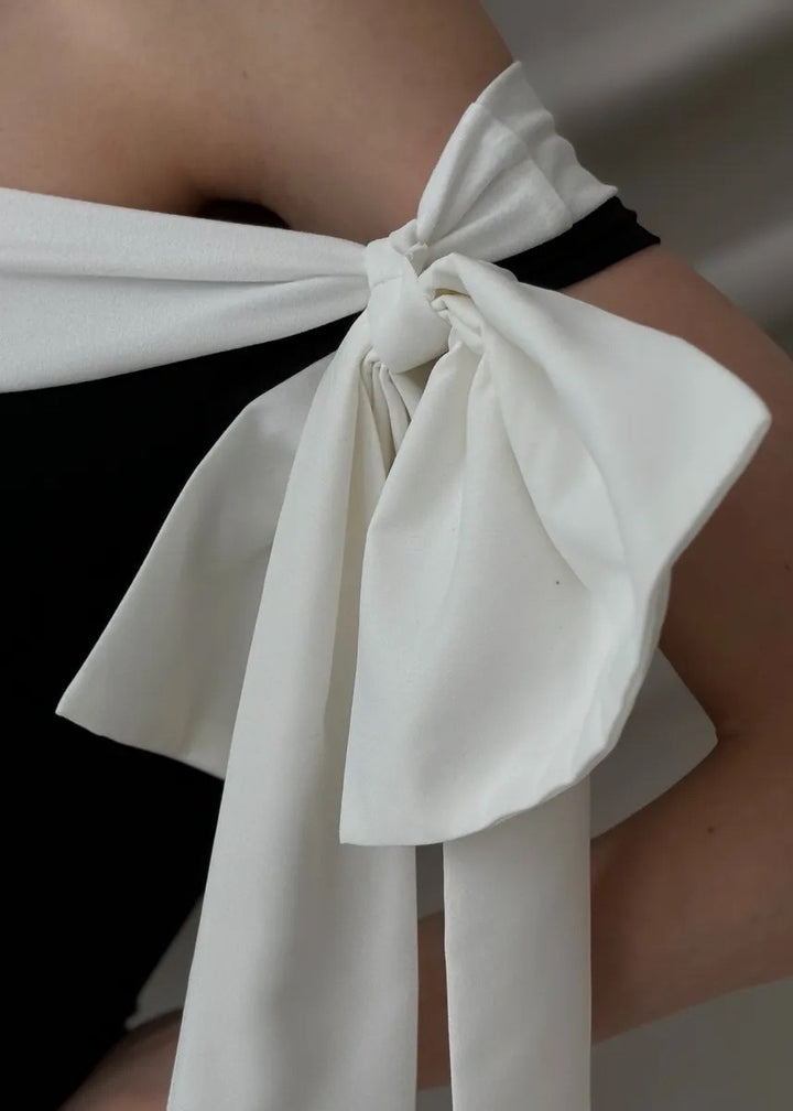 - Bow Tie Detail: A large, stylish bow on one shoulder adds a playful yet chic element.