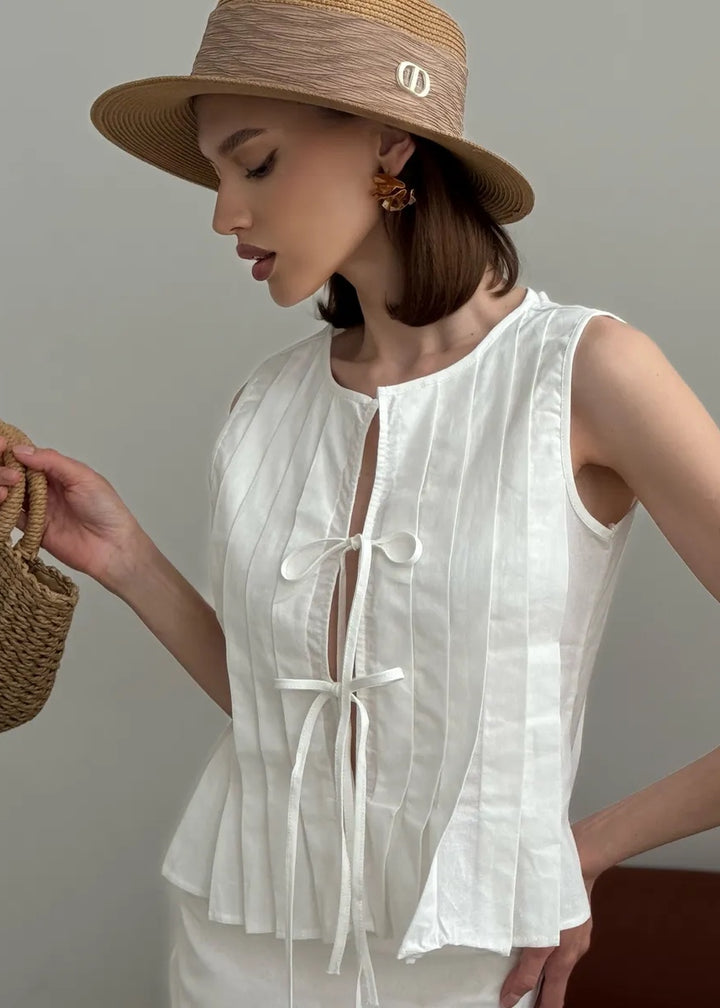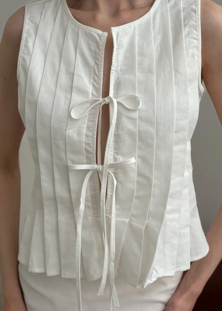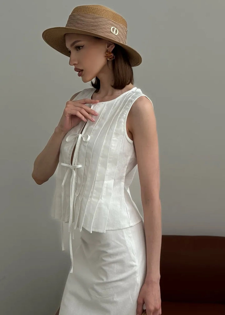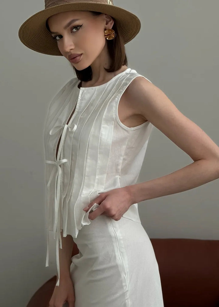 - Top Design: Sleeveless with a pleated front and tie closure for a customizable fit.
