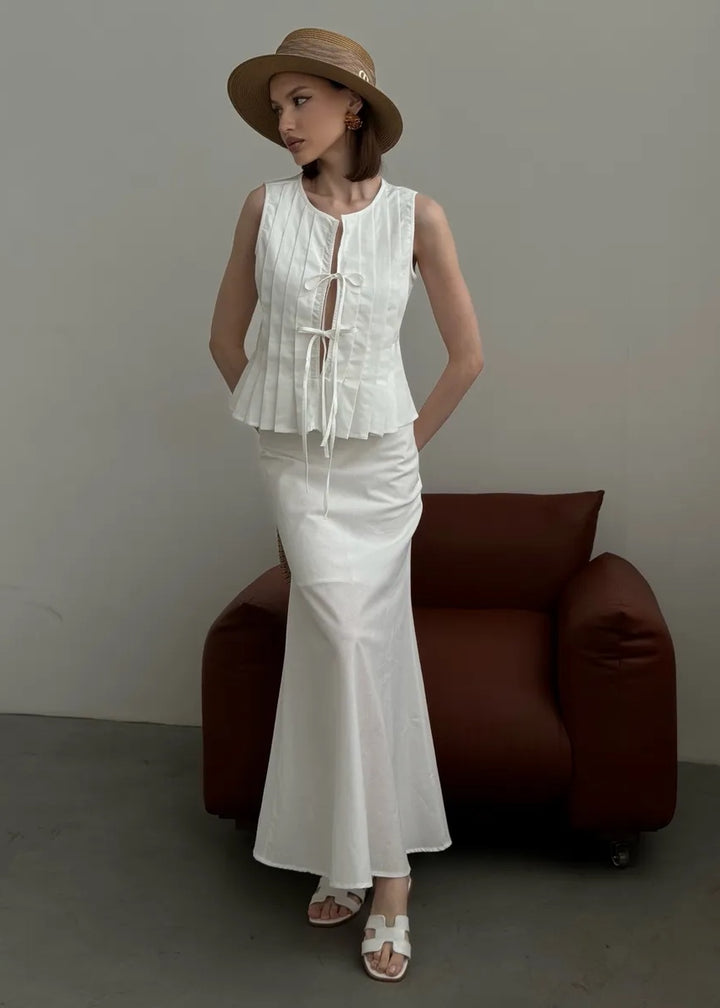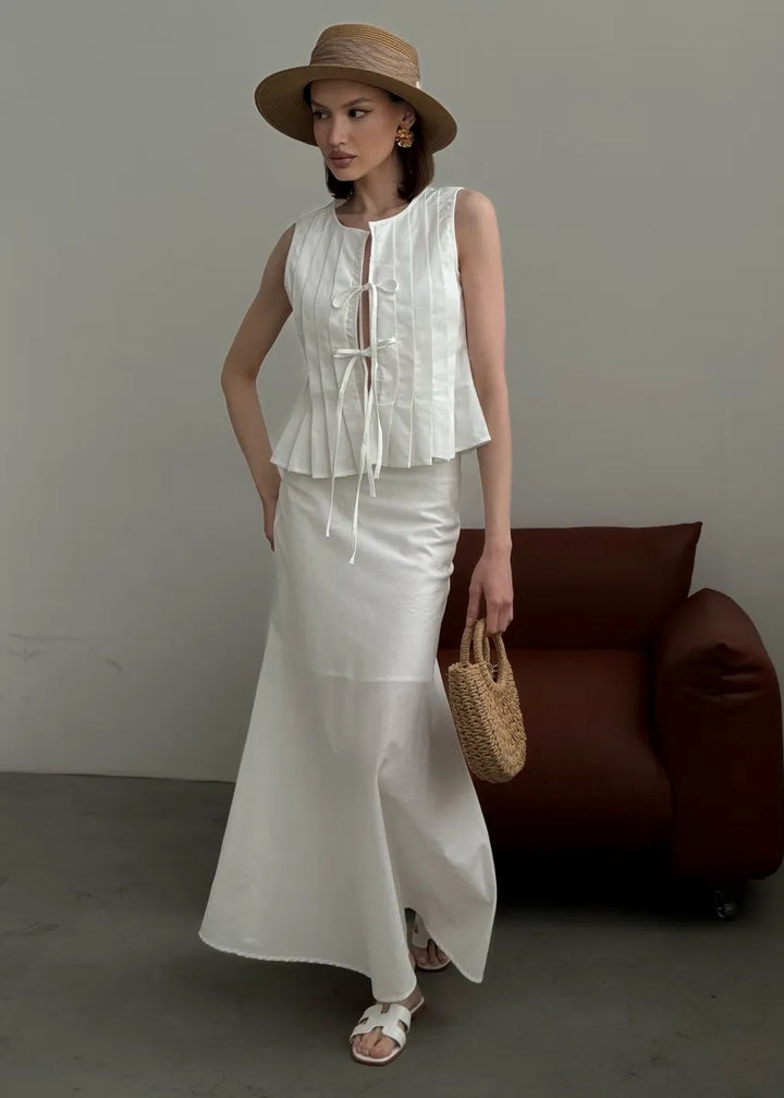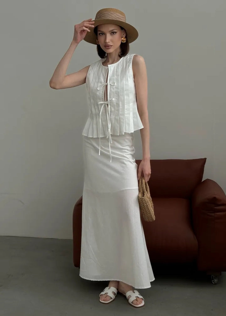 Pleated Front Tie Top and Maxi Skirt Set
