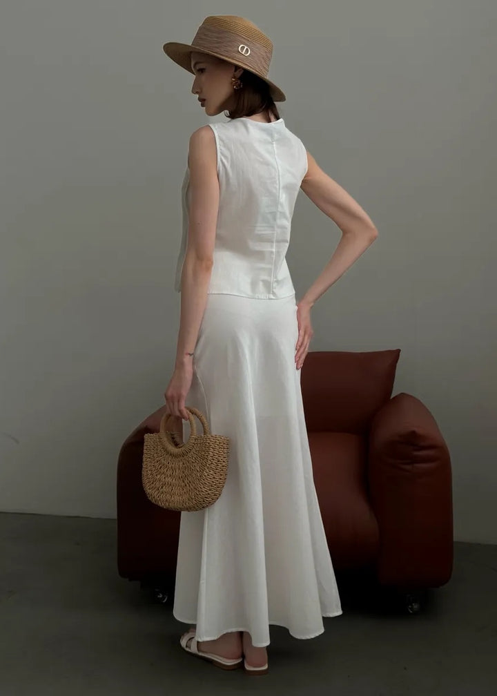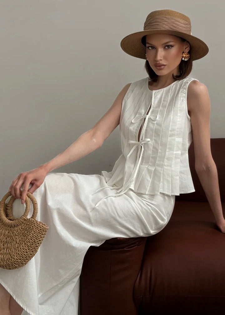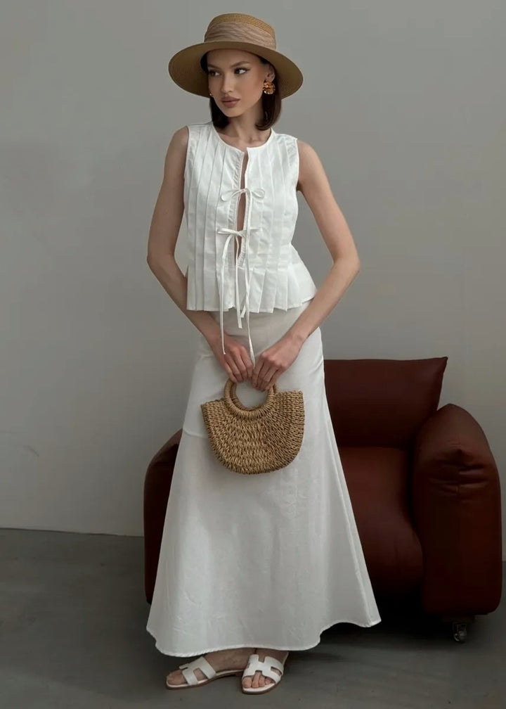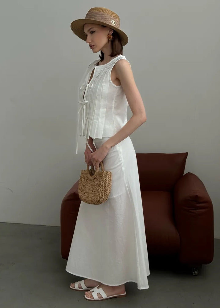 Embrace elegance with our Pleated Front Tie Top and Maxi Skirt Set. This chic ensemble combines the breathable qualities of cotton and linen, featuring a stylish sleeveless top with a unique pleated design and a flattering tie closure. The matching maxi skirt offers a graceful silhouette, making this set perfect for both casual outings and special occasions.