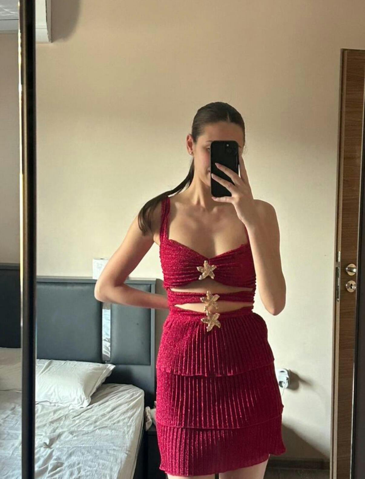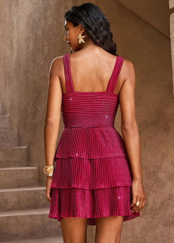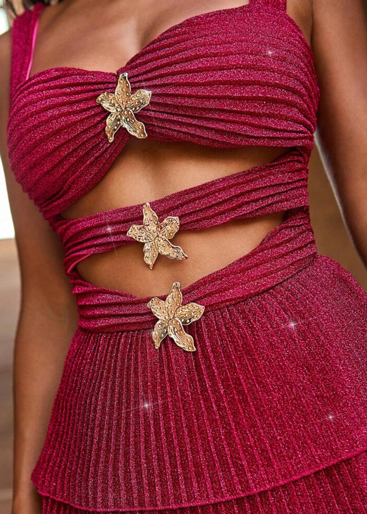 This dazzling mini dress is designed to make a statement. It features a fitted, sweetheart neckline bodice with wide, supportive straps. A unique cutout detail at the midriff is accentuated with a decorative star-shaped embellishment. The skirt boasts playful, tiered ruffles with delicate pleating throughout, creating volume and movement. Shimmering sequins are embedded within the fabric, catching the light beautifully with every step.