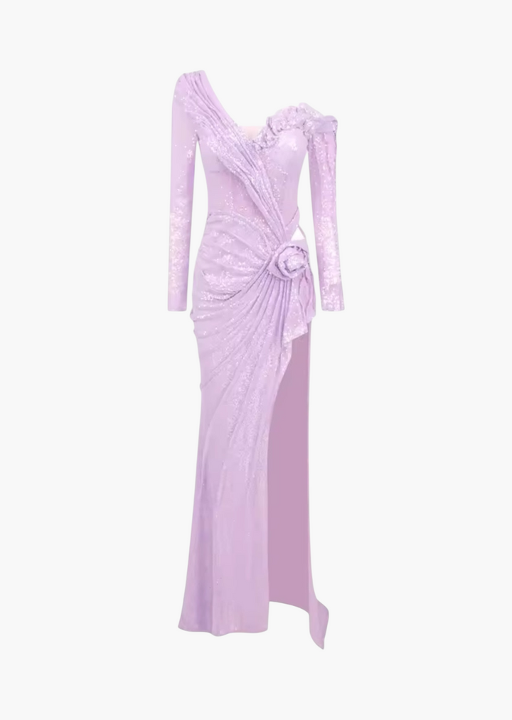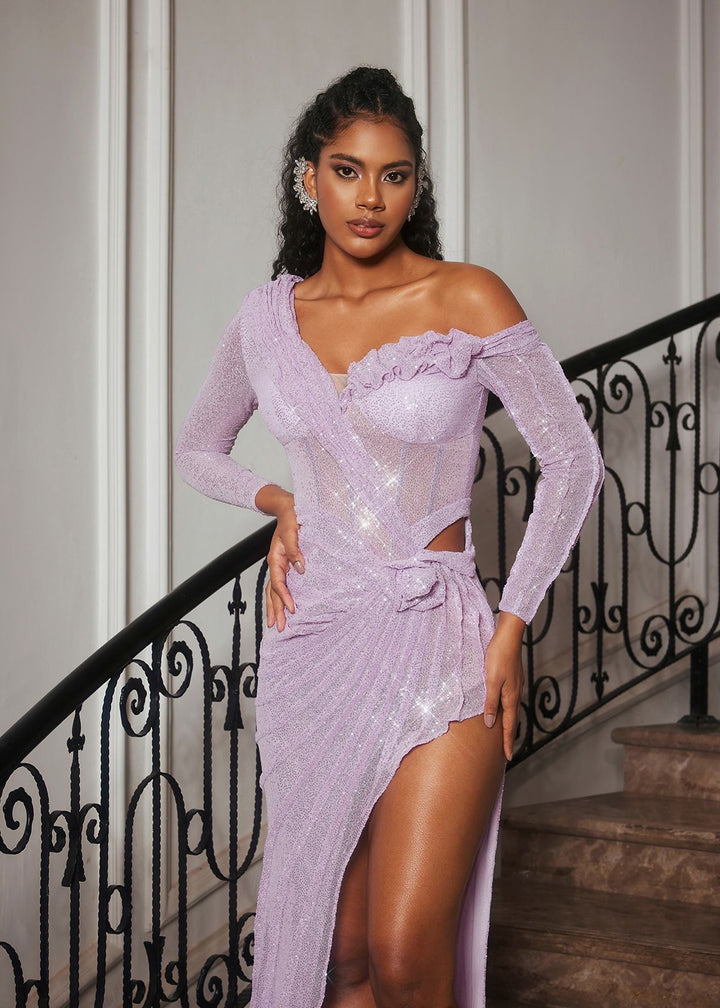This striking gown features an asymmetrical neckline with a single long sleeve and a ruffled accent along the shoulder. The bodice has a defined, possibly corseted structure, with draped fabric that gathers at the side, creating a dramatic high slit. The dress has an all-over shimmering effect.