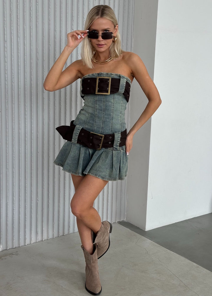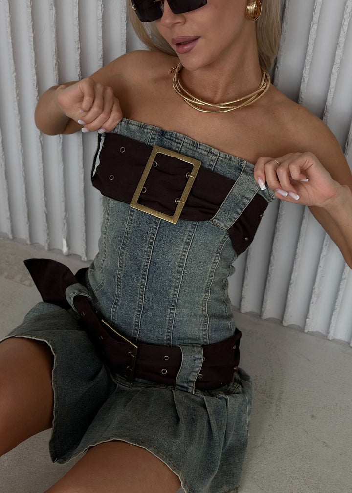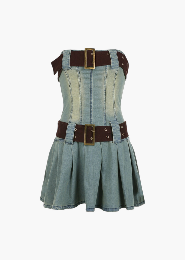 Introducing the Strapless Denim Dress with Belted Detail, a chic and stylish piece that combines casual comfort with a trendy flair. This dress features a unique design that highlights the waist while providing a playful silhouette.