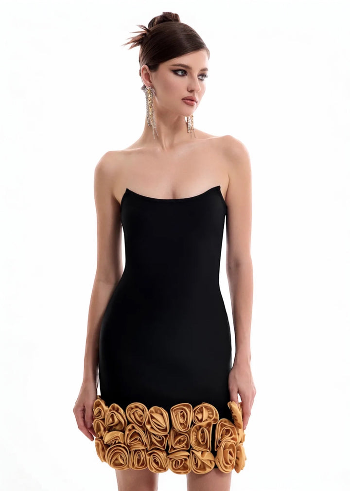 This sophisticated mini dress offers a contemporary twist on a classic silhouette. It features a unique strapless neckline with a subtle wave or sculpted dip, providing a modern and refined touch. The bodice is sleek and form-fitting, designed to hug the curves. The main distinguishing feature is the hemline, which is adorned with a rich border of dimensional floral appliques, creating a luxurious and textured finish. The dress is cut to a mini length, making it ideal for showcasing legs. Crafted from a structured yet comfortable fabric, this dress is perfect for cocktail parties, evening events, or any occasion where you want to exude elegance with a distinctive flair.