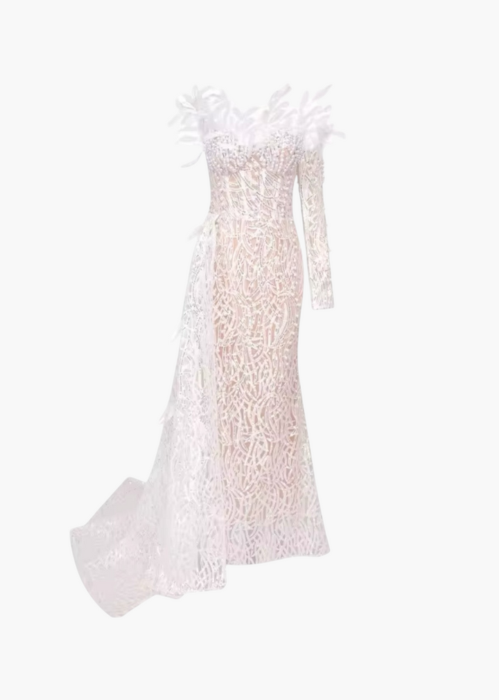 This striking gown features an asymmetrical design with a single long, fitted sleeve and one bare shoulder. The neckline is a subtle sweetheart shape, embellished with delicate feather detailing that extends to the shoulder. The entire gown is intricately adorned with a textured, sequined and beaded pattern, creating a shimmering effect. A dramatic, layered train flows from the skirt, adding volume and elegance. The gown has a fitted silhouette through the bodice and hips, flaring out towards the hemline.