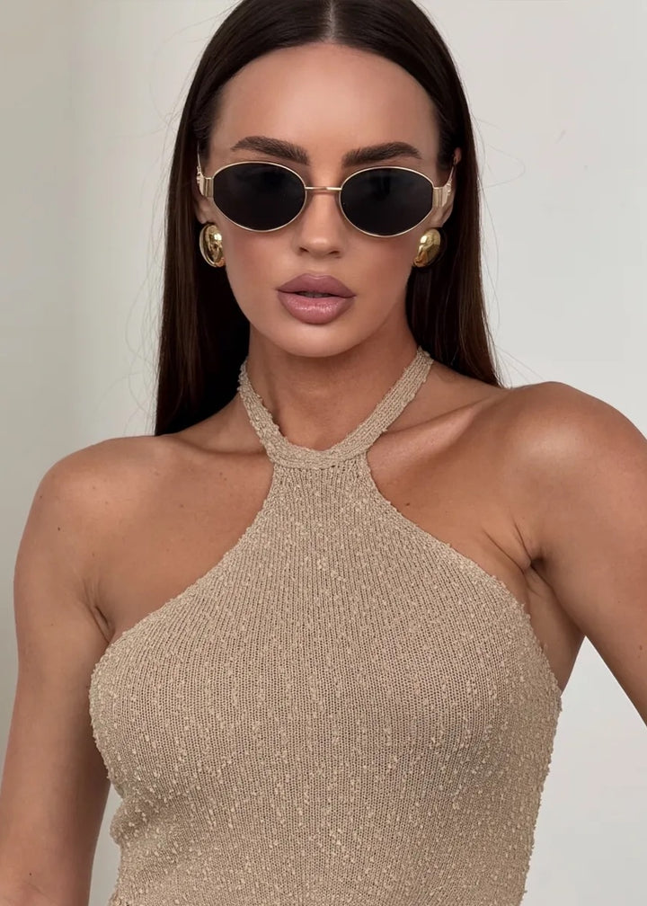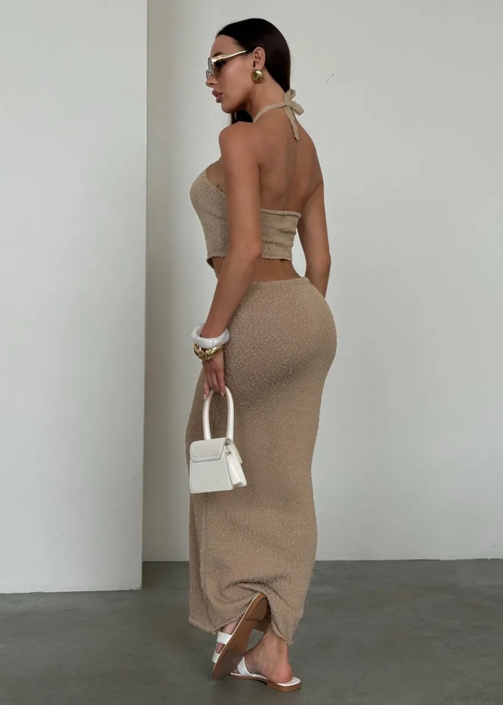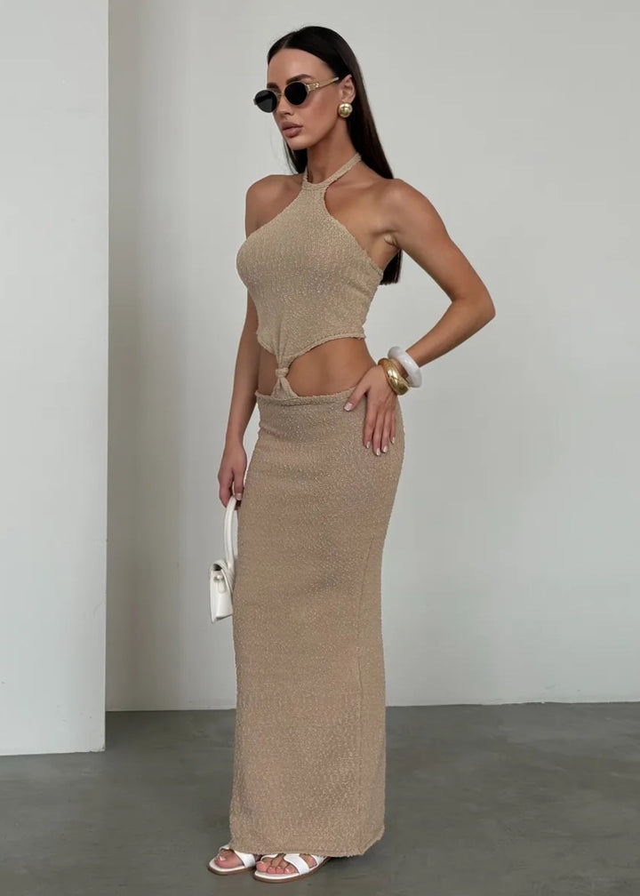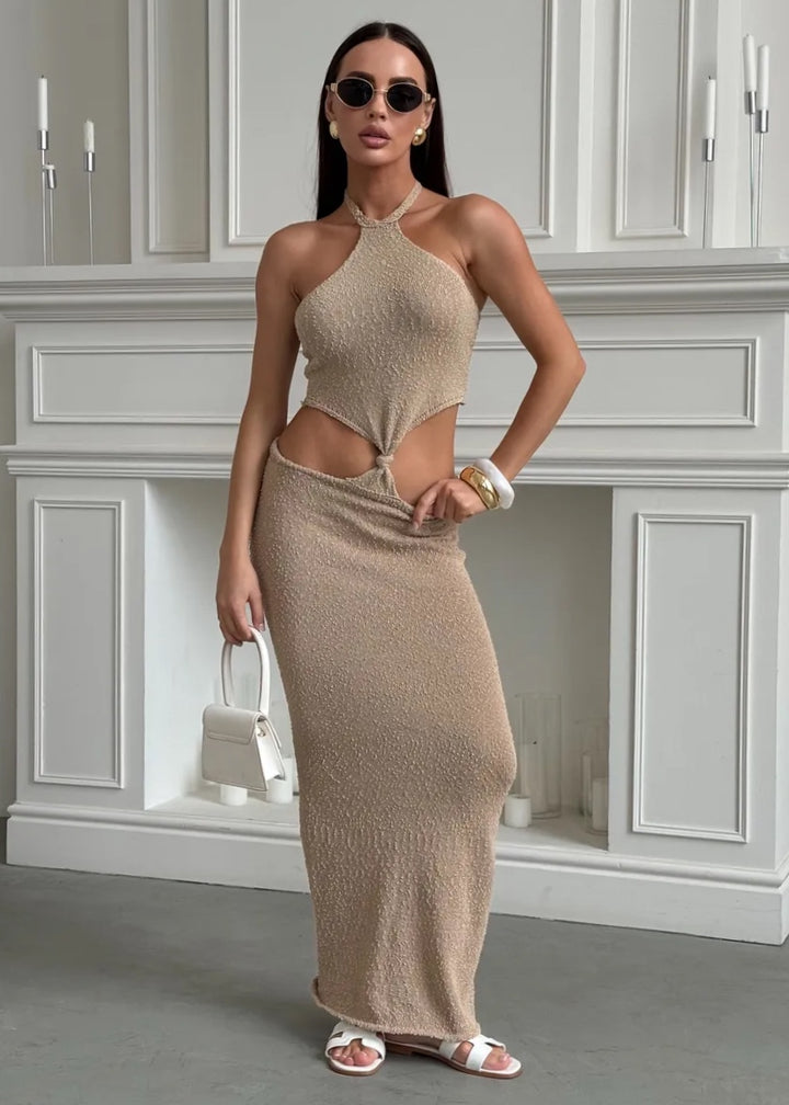 Elevate your wardrobe with the Halter Neck Cut-Out Maxi Dress with Twist Detail. This stunning piece features a unique halter neck design that beautifully frames the shoulders while offering a secure fit. The dress showcases a daring cut-out at the waist, adding an element of allure and sophistication. The twist detail at the front creates a flattering silhouette, accentuating your curves in all the right ways.