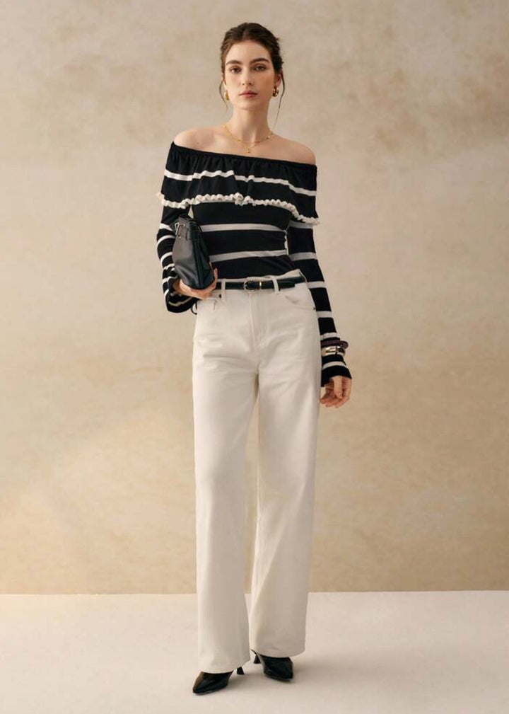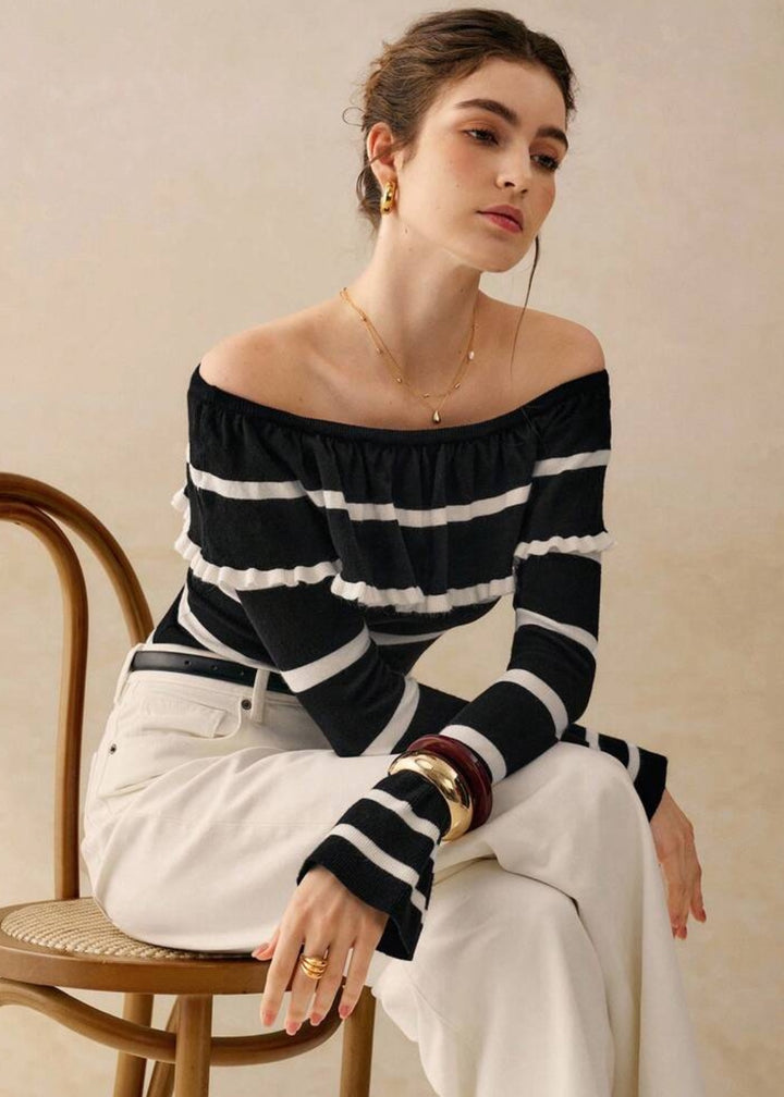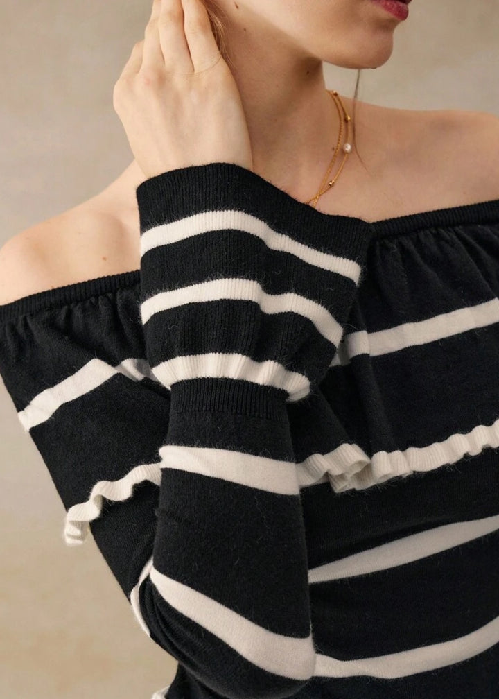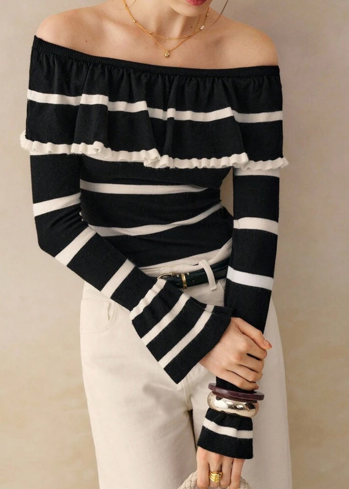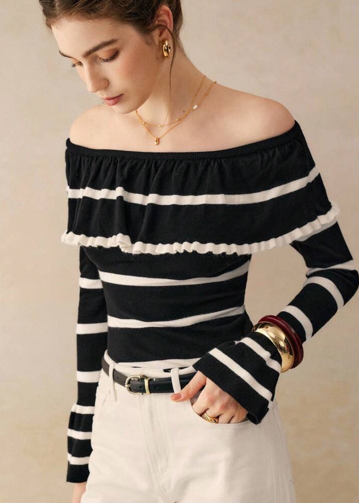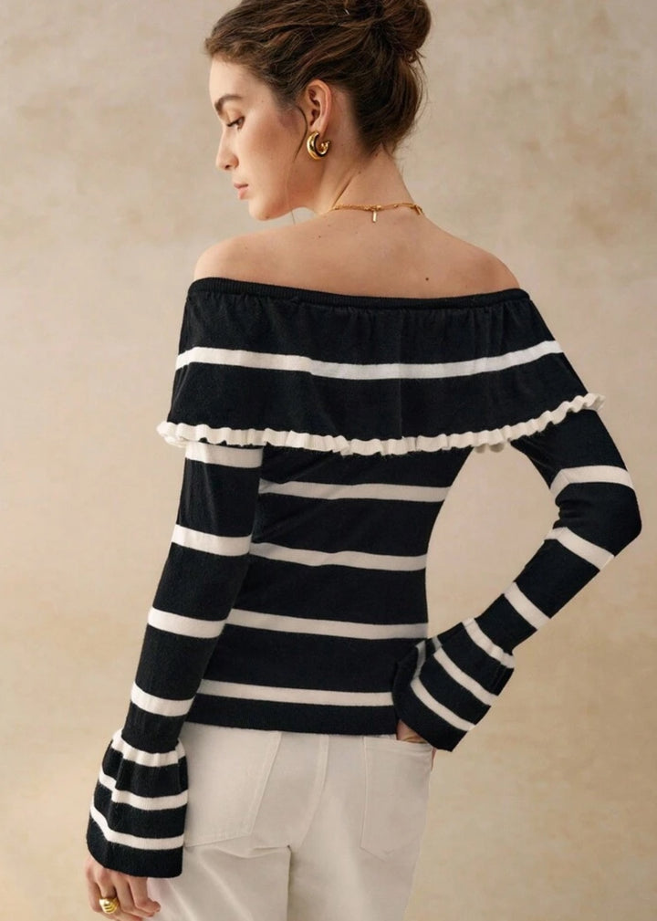 This stunning off shoulder top features a playful ruffled collar and elegant bell sleeves. The classic black and white stripes add a touch of sophistication to any outfit. Perfect for a night out or a day at the office, this top will elevate your wardrobe effortlessly.