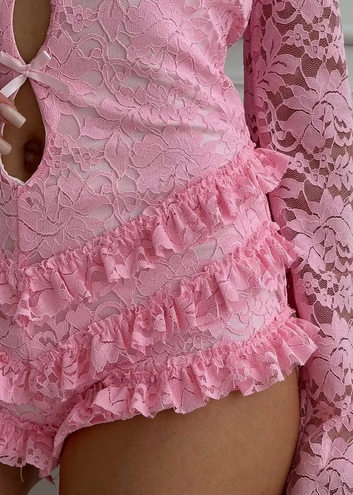 Introducing our Lace Long Sleeve Playsuit with Ruffle Details, a stylish and playful addition to your wardrobe. This versatile playsuit is perfect for a variety of occasions, combining elegance with a fun twist.