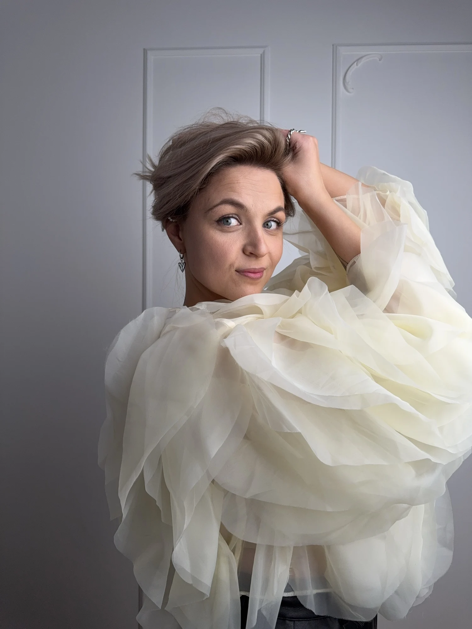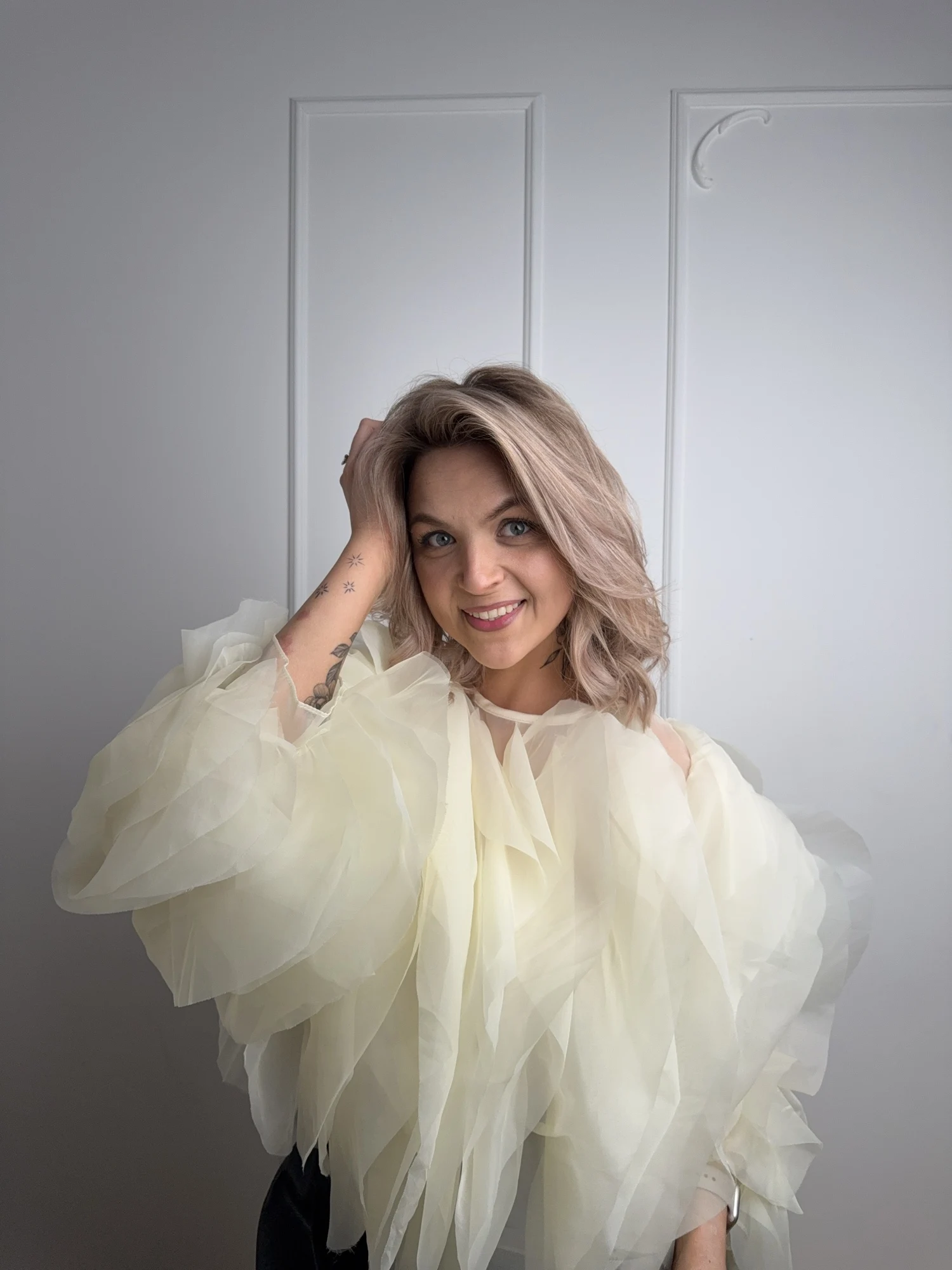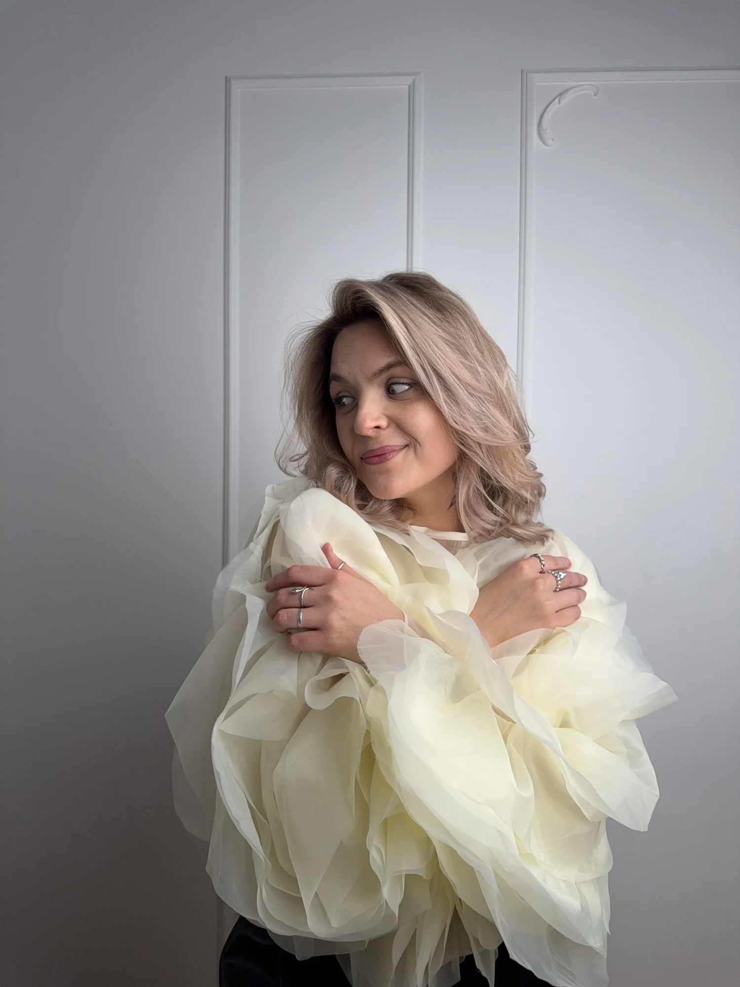 This blouse is designed with delicate organza and features a flattering layered ruffle design. The beige color adds a touch of elegance, making it the perfect addition to any wardrobe. Enjoy the breathability and lightweight feel of organza while looking stylish and sophisticated.