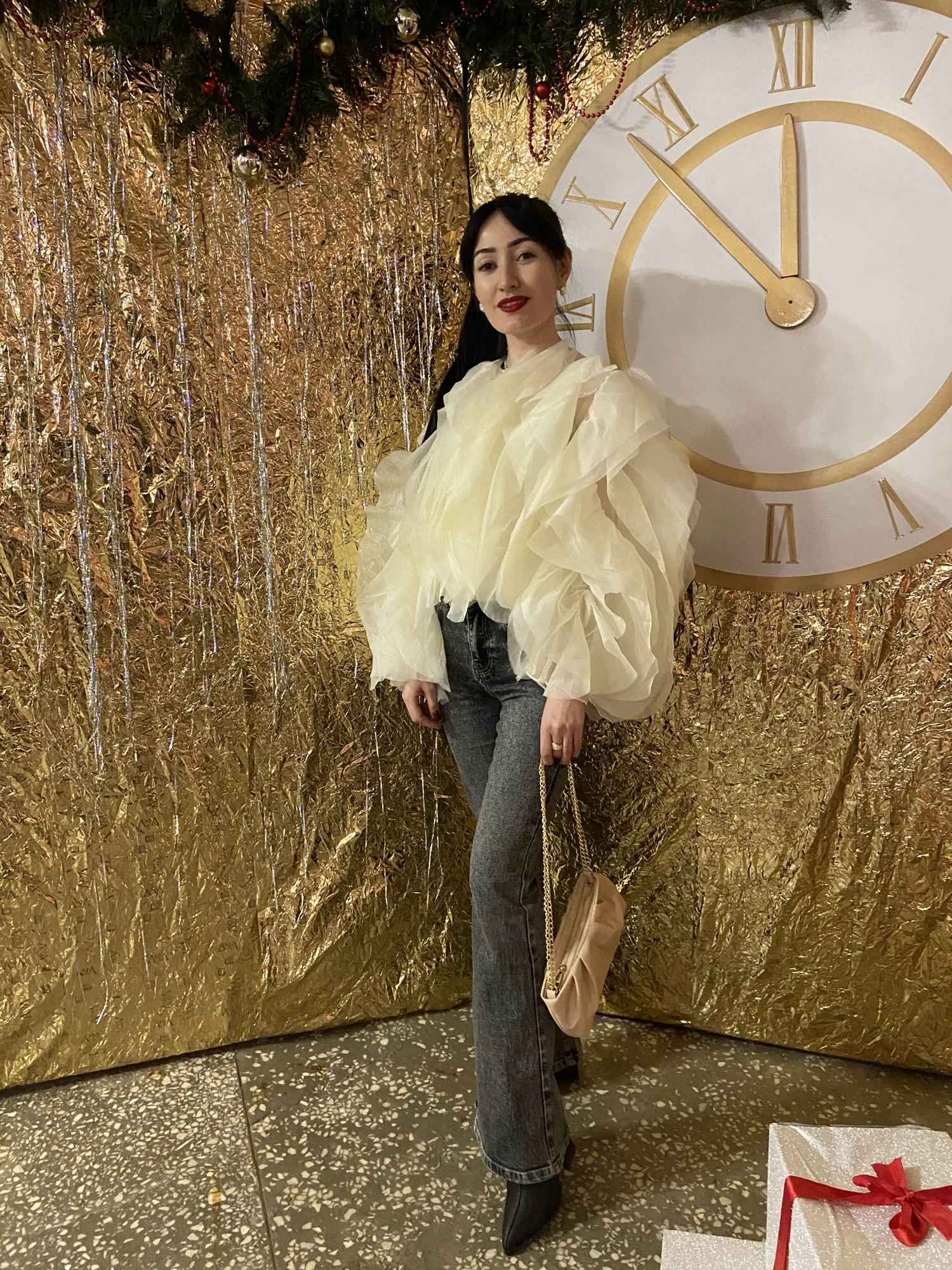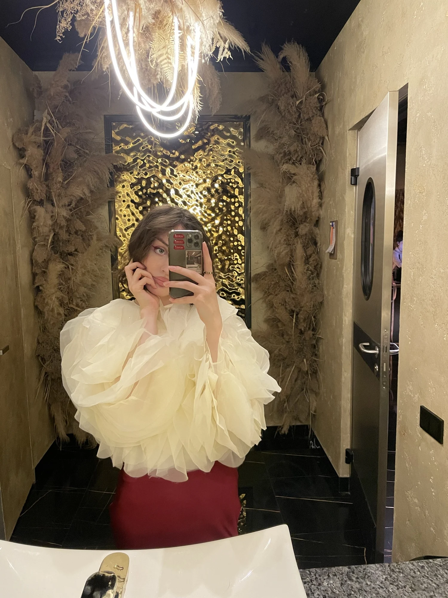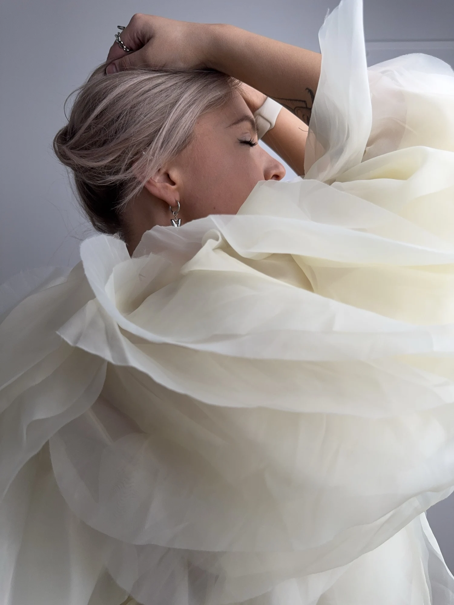 This blouse is designed with delicate organza and features a flattering layered ruffle design. The beige color adds a touch of elegance, making it the perfect addition to any wardrobe. Enjoy the breathability and lightweight feel of organza while looking stylish and sophisticated.