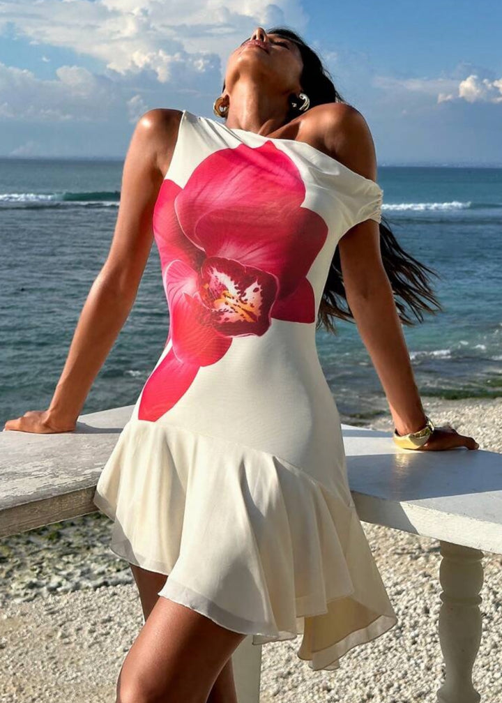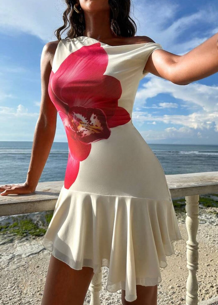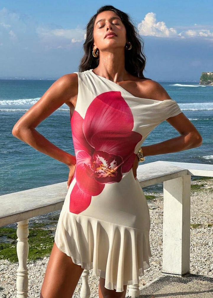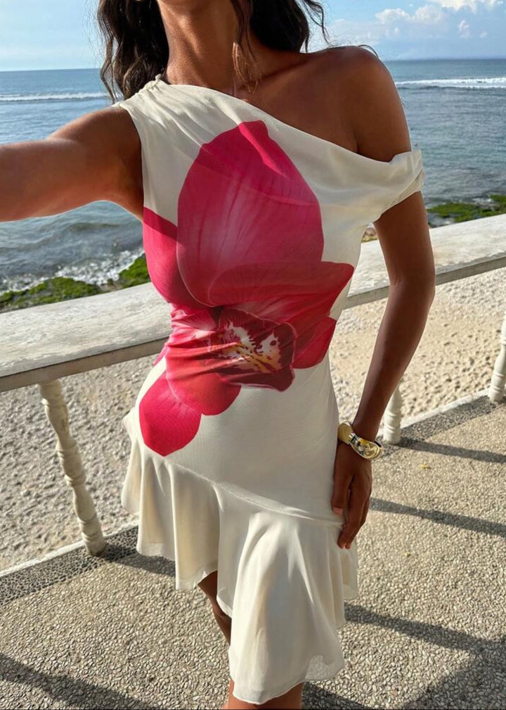 This mini dress is a stylish and playful garment, perfect for warm-weather occasions. It features a unique asymmetrical neckline with a one-shoulder strap on one side and a draped off-the-shoulder sleeve on the other, creating a dynamic silhouette. The dress is defined by a large, prominent orchid print that dominates the front, adding a touch of tropical elegance. The fitted body flows into an asymmetrical hemline, finished with a delicate ruffle detail for a flirty and fun finish. This dress is a perfect choice for resort getaways, daytime events, or social gatherings.