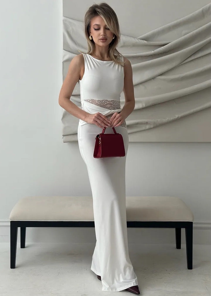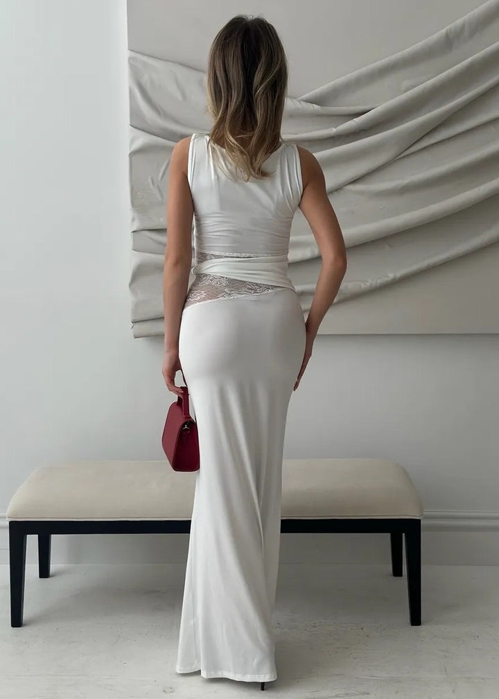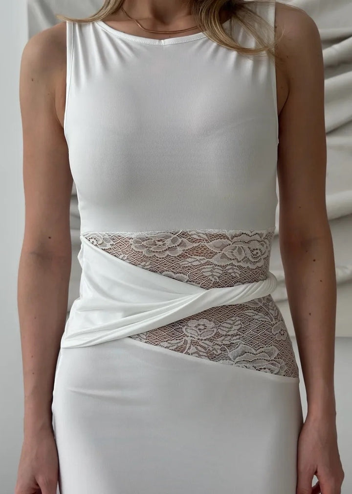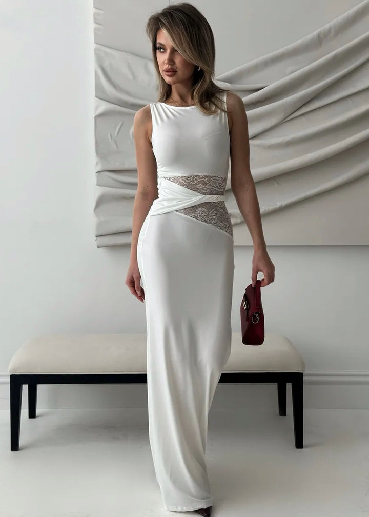 Introducing the Lace Wrap Design Maxi Dress, a stunning addition to your wardrobe that combines sophistication with a touch of allure. This dress features a sleek silhouette accentuated by a unique wrap design at the waist, showcasing exquisite lace detailing that adds a delicate charm. The sleeveless design ensures comfort and flexibility, making it perfect for various occasions.