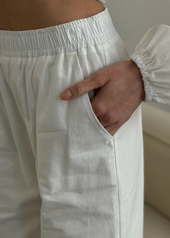 - Pants Design: Wide-leg pants with an elastic waistband and side pockets