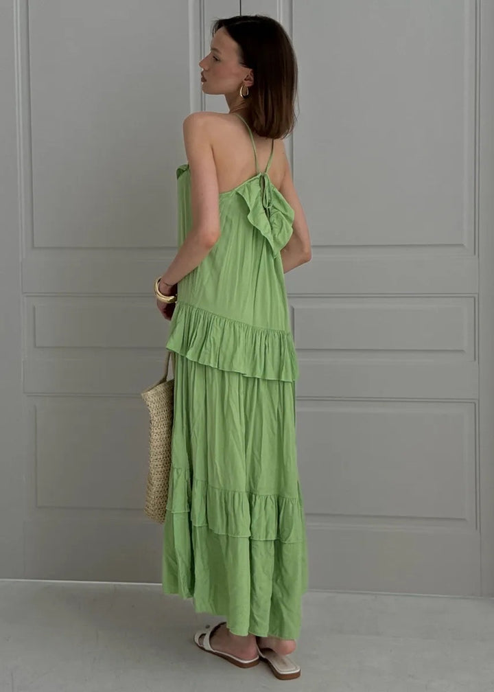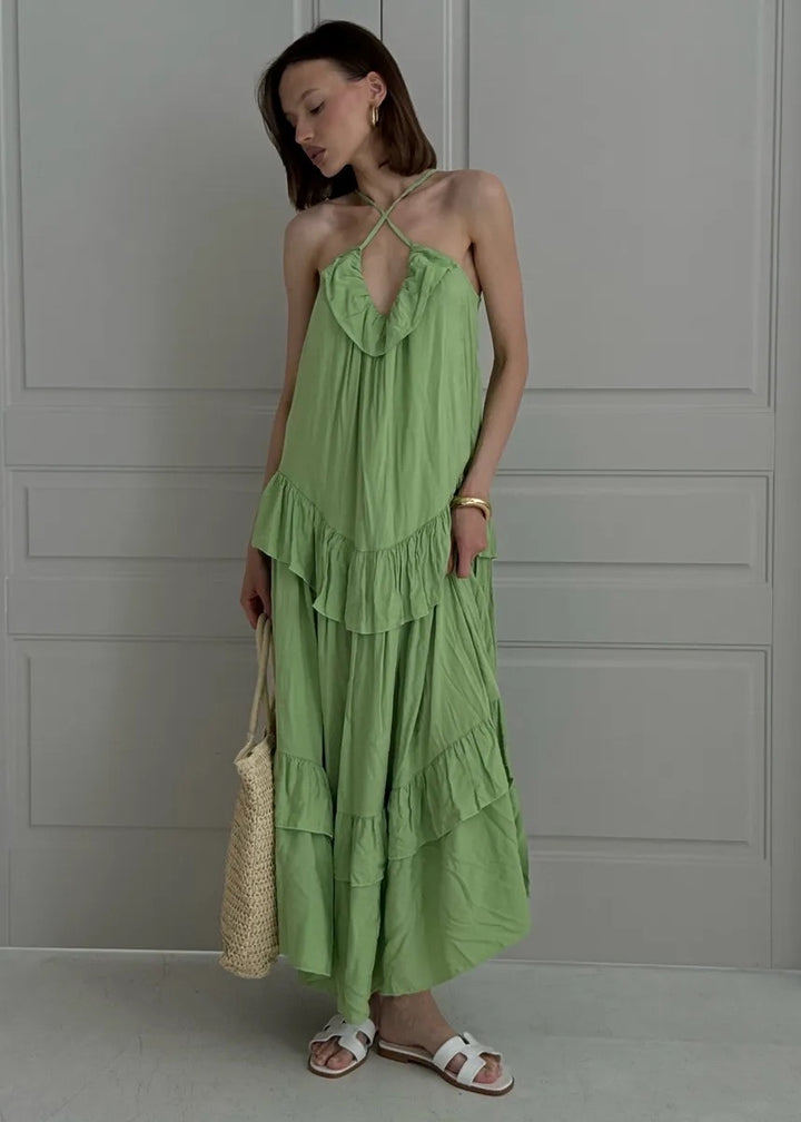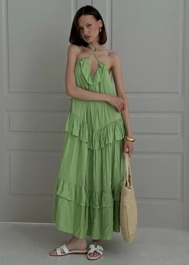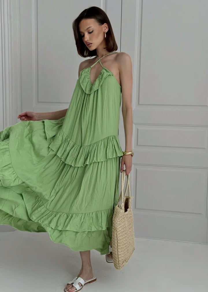 Introducing the Halter Neck Ruffle Tiered Maxi Dress, a delightful blend of comfort and style perfect for warm weather. This dress features a playful tiered design with ruffled accents that add dimension and movement. The halter neck style elegantly frames the shoulders, while the keyhole detail enhances the overall appeal. Ideal for beach days, casual outings, or summer parties, this maxi dress is a must-have addition to your wardrobe.