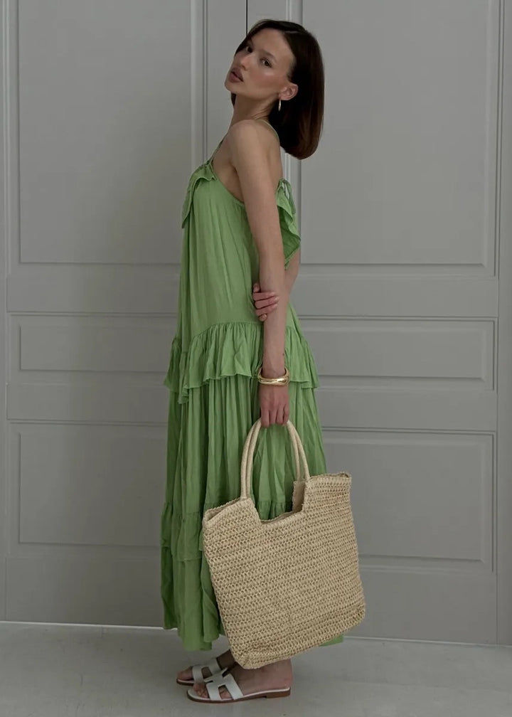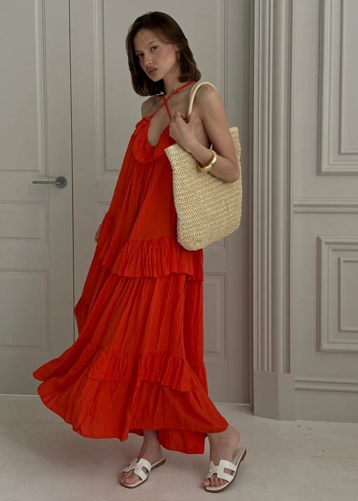 - Tiered Maxi Length: Flows gracefully to the floor, allowing for ease of movement and comfort.