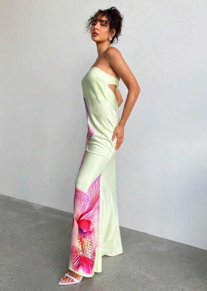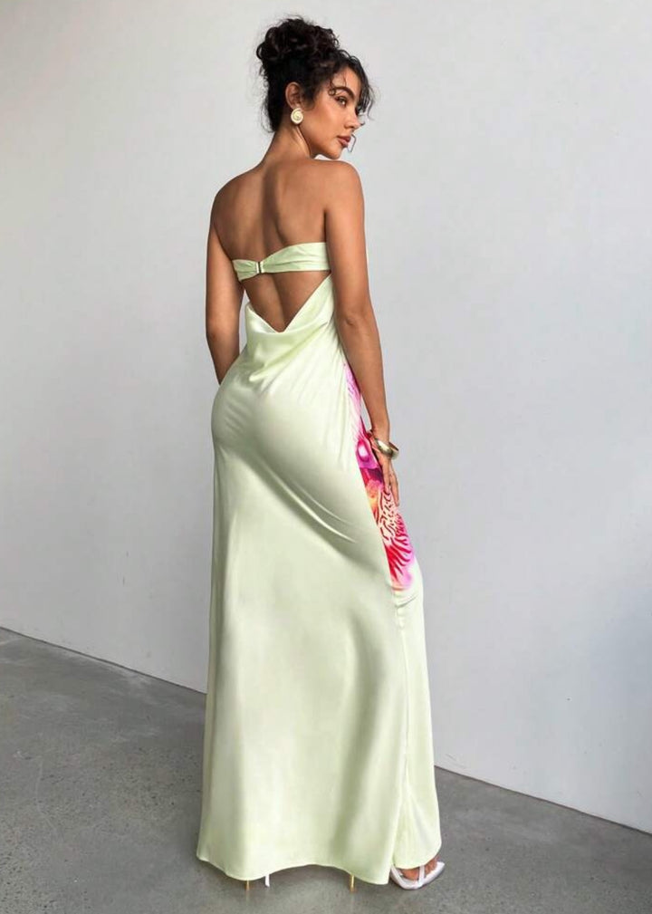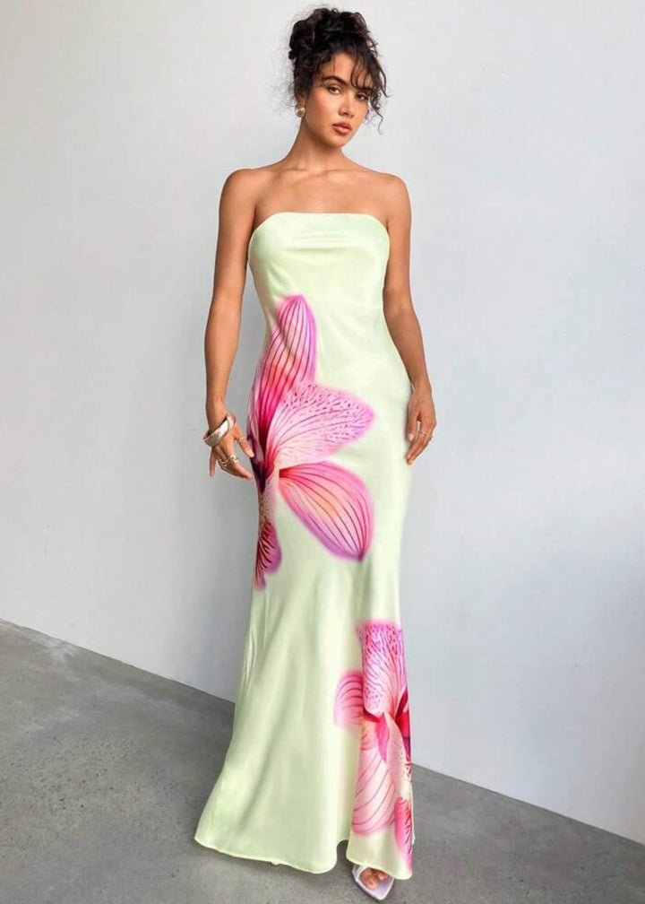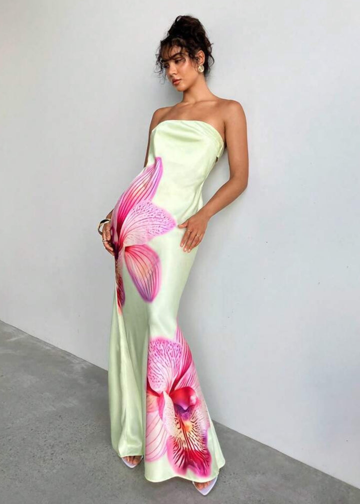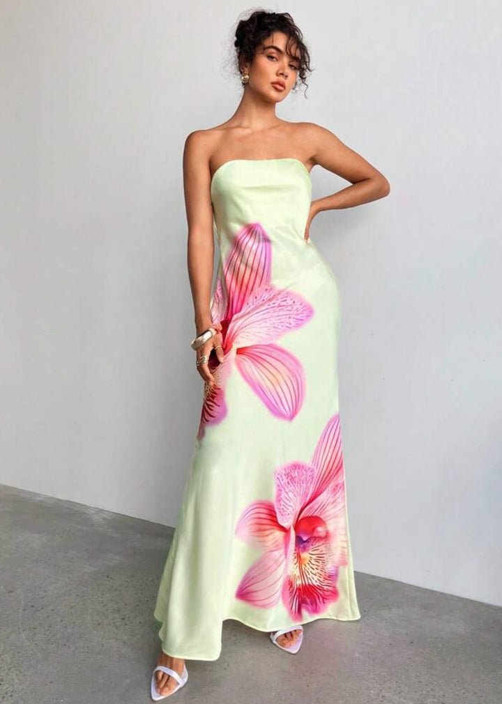 This elegant maxi dress is designed to make a sophisticated statement. It features a sleek strapless neckline and a fitted silhouette that flows gracefully to the floor. The dress is characterized by strategically placed large floral prints that accent the design, creating a visually stunning and balanced aesthetic. The back of the dress features a low, open design secured with a delicate horizontal strap. Crafted from a smooth, flowing fabric, this dress is perfect for special occasions where you want to exude refined elegance with a touch of botanical charm.