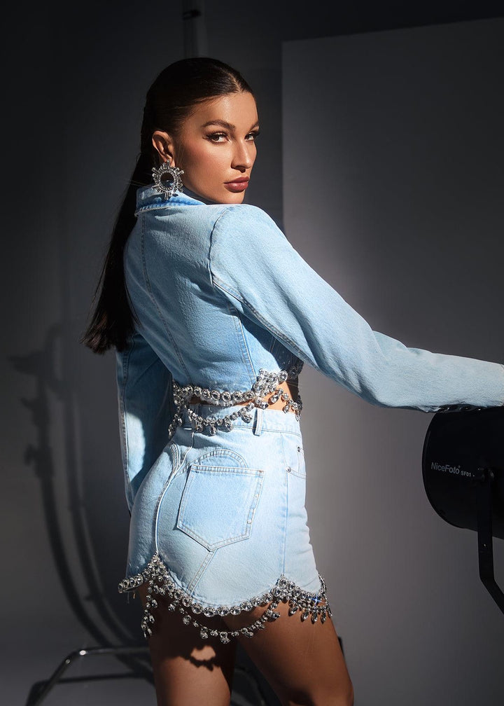 This unique cropped denim jacket features a classic lapel collar and long sleeves. The design is defined by its dramatic front cutout with a rhinestone chain embellishment that extends around the waist. The jacket has a single-button closure at the hem, creating a fitted, structured silhouette.